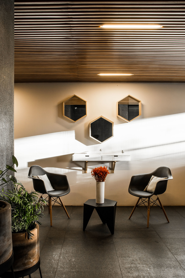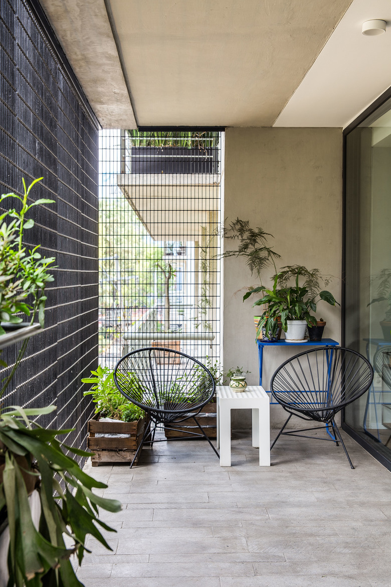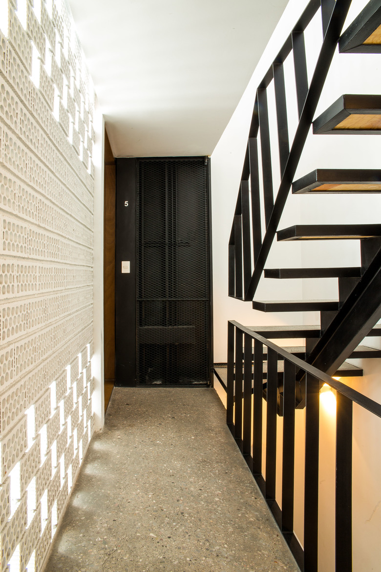 A partir del 2do nivel y los que siguen, el esquema estructural y funcional permitió generar espacios holgados que integran la zona pública con una terraza y que por medio de jardineras como elementos estéticos logran contener el área y a su vez crear una relación entre la naturaleza del contexto y la esencia del proyecto. La paleta de materiales que conforma la estética del edificio responde a la integración de 3 elementos: vegetación, luz y transparencia, de esta manera predomina el uso de concretos aparentes, acero y cancelería de aluminio con vidrio, generando una fachada con movimiento que se aleja de la uniformidad que normalmente supone un edificio de viviendas.