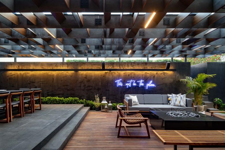 El área de jardín se aprovechó para generar una terraza cubier-ta que integra la estancia y comedor con el exterior. La cubier-ta a base de vigas de acero y vidrio se diseñó con parasoles de viroc que logran un juego con iluminación natural y artifi-cial. Parasoles de madera de nogal semi inclinados fueron dispuestos entre las horizontales de viroc para crear un patrón aparentemente desordenado que protegiera a la terraza de la incidencia solar.