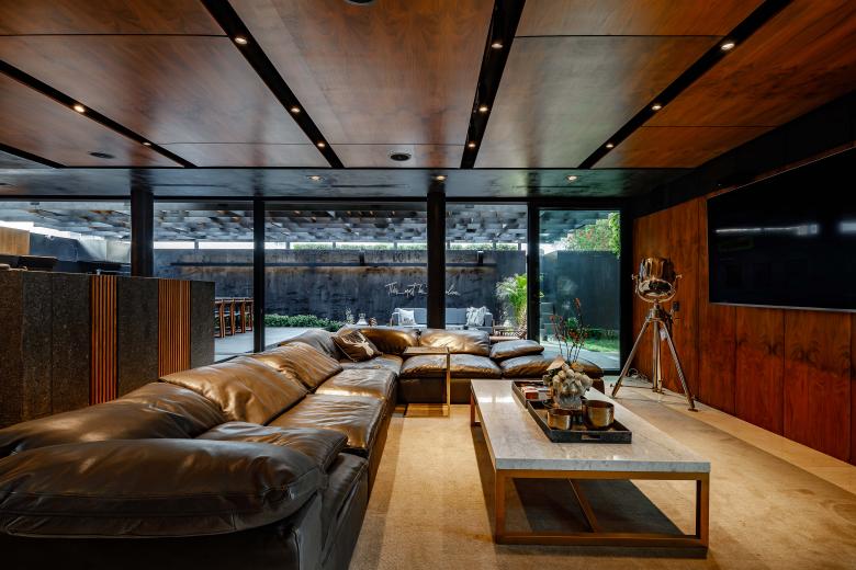 En planta alta, una luminaria colgante enmarcada por un pla-fón flotado como remate visual, cuya función es brindar som-bra y regular la temperatura del family room. En las recámaras secundarias, muros con colores neutros complementaron los muebles de madera de nogal y viroc. En cambio, para la re-cámara principal, se diseñó un plafón de madera tipo marim-ba, cuya ligereza contrasta con los tableros de viroc que confi-nan al vestidor, y permiten generar el acceso tanto a la recá-mara como al baño de la misma.