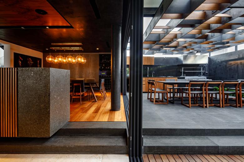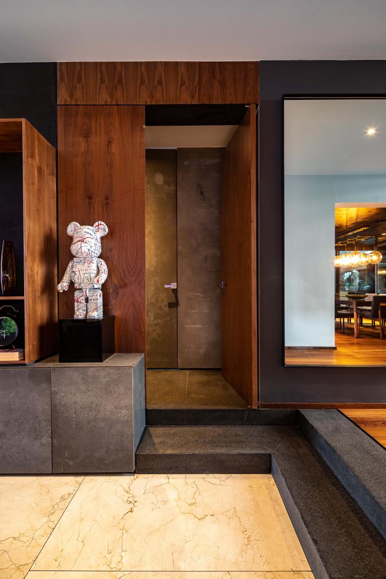 Los espacios en planta baja se diferencian por el cambio de plafón y el uso de los materiales en muebles y muros. En el área de acceso, el plafón totalmente blanco, marca el eje rector de la casa, y tiene como complemento principal un mue-ble integrado a la circulación que te recibe y te da la bienveni-da. Como contraste, en el área de la estancia, el plafón es de madera brindándole así mayor calidez al espacio. Estancia y comedor se encuentran separados por un desnivel y una barra semi flotada brindándole así mayor jerarquía al comedor. El desnivel continúa hasta el área de la terraza, separando a su vez el comedor exterior y el lounge.