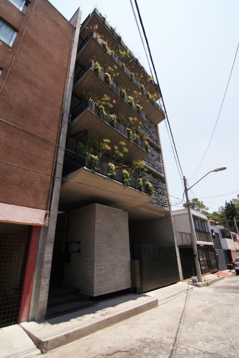El edificio está conformado por cinco departamentos, uno por cada nivel. Dado el tamaño del terreno se opto por una estructura de concreto, solo 2 cartelas en las colindancias unidas por una losa de concreto reticular, por esta razon no hay columnas ni muros de carga en todo el edificio, lo que lo dota de una total flexibilidad en todos los espacios interiores. La mayoría de los materiales tanto de la estructura como de acabados, incluyendo los pisos de terrazo y la celosía de concreto, fueron hechos en sitio.