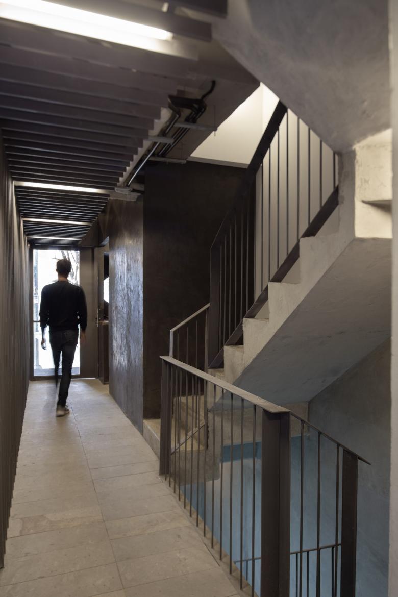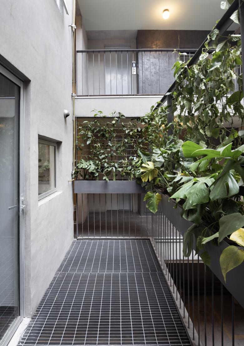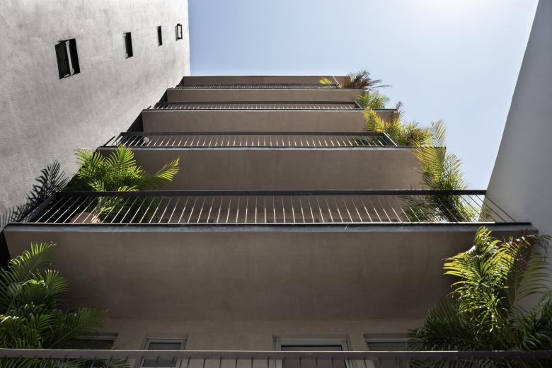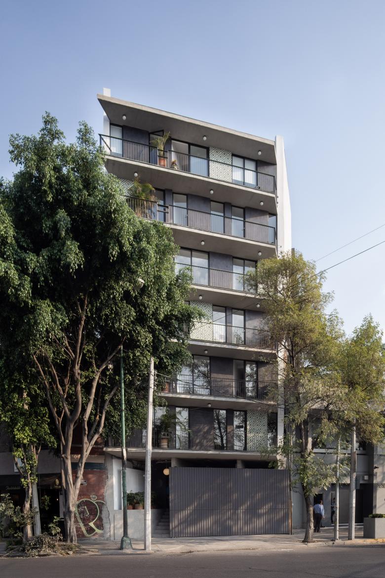 Se compone de un nivel de estacionamiento en semi sótano y otro en el primer nivel, así como 6 niveles más con 12 departamentos en total.