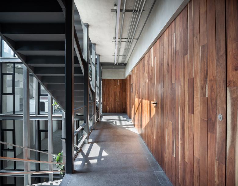 El volumen de características rectangulares se plantea a partir de un esquema muy sencillo en el que módulos de oficinas son dis-tribuidos en 4 niveles y se articulan a través de un núcleo vertical de circulación dispuesto dentro de un patio de iluminación cu-bierto de vegetación. Esta situación brinda a las oficinas sensa-ción de amplitud y privacidad de los demás espacios. Asimismo, su orientación permite la mayor recepción de luz natural durante el horario laboral.