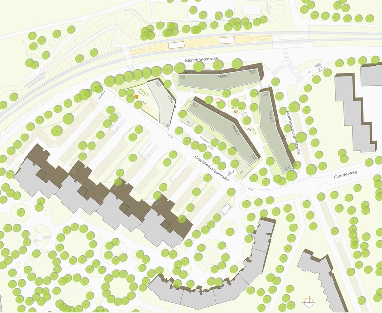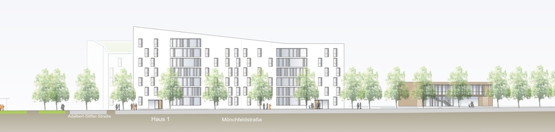 Ein Ensemble aus drei Wohnzeilen umschließt einen gemeinsamen Gartenhof. Sie bilden zugleich Raumkanten zu den anliegenden Straßenzügen der Mönchfeld- und Adalbert-Stifter-Straße und wirken schallschützend gegen den Verkehrslärm. Der entlang der Erschließungsstraße positionierte und von der Grundstücksgrenze zurückgesetzte dritte Zeilenbau schirmt den Quartiersgarten ab von den Schallemissionen der Parkplatzanlage im Vorfeld des Julius-Brecht-Hauses. Die differenzierte Höhenentwicklung zwischen vier und sieben Geschossen sowie die 'transparente Auflösung' der geschlossenen Lochfassaden im Bereich der Treppenhäuser gliedern die Gebäudevolumen entlang der Straßenzüge. Der 'flügelförmige' Anschnitt der Baukörper erzeugt spannungsvolle, fließende Räume, die den Innenbereich der Anlage an drei Seiten zur Umgebung hin öffnen und vielfältige Aus- bzw. Einblicke in das Quartier gewähren. Insbesondere an der Ecke Mönchfeld- / Adalbert-Stifter-Straße, gegenüber den