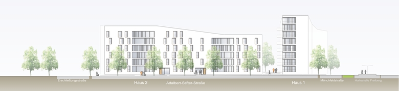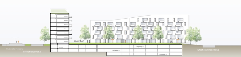 Haltestellen des ÖPNV, eröffnet die Fuge zwischen den randständigen Wohnzeilen Einblick und Zugang in die Mitte des Quartiers. Treppenanlage, Vorplatz und die zueinander versetzten schlanken Schmalseiten der Zeilenbauten bilden einen urbanen Auftakt in das Wohngebiet Freiberg. Die Durchlässigkeit des Areals erweitert das Angebot an fußläufigen Wegverbindungen in diesem Stadtbereich und knüpft an das bestehende Wegenetz an. Zusätzliche Überwege an der Kreuzung Adalbert-Stifter-Straße / Mönchfeldstraße sowie optional auch ein weiteres Mal an der Mönchfeldstraße auf Höhe der Kita unterstützen und sichern den Fuß- und Fahrradverkehr.
