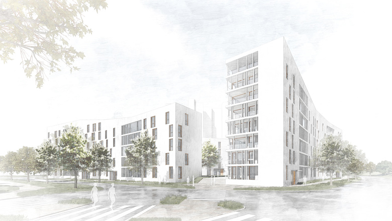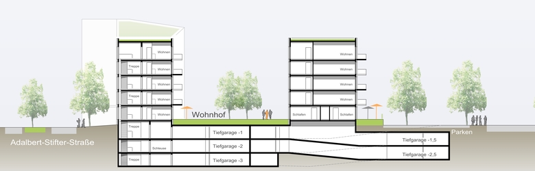 Der Entwurf setzt sich daher das Ziel, inmitten dieses heterogenen Stadtfeldes eine angemessene Typologie für verdichtete moderne Geschosswohnungsbauformen zu entwickeln, mit maßstabsgerechten Baukörpern und attraktiven, gemeinschaftlich nutzbaren Freiräumen sowie - nicht zuletzt - mit einer eigenständigen, städtebaulichen Prägnanz, die sich unter Ausbildung einer individuellen Identität gegenüber den teilweise vielgeschossigen solitären Dominanten in der Nachbarschaft behaupten kann.