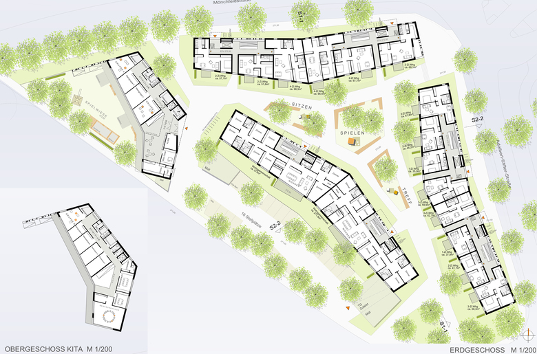 Die dreigruppige Kita an der Westspitze des Baufelds verfügt über einen eigenen, den Wohnhof nicht störenden Außenbereich und ergänzt als zweigeschossiger Solitärbau die Gebäudegruppe der drei Wohnzeilen. Außenspielfläche und Gruppenräume orientieren sich nach Westen.