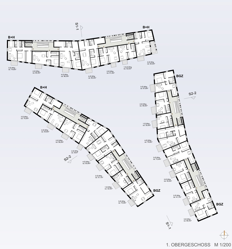 Mit Ausnahme der westlichen Hausgemeinschaft im Haus 1, die als Dreispänner organisiert ist, sind alle weiteren Hausgemeinschaften als Vierspänner angelegt - mit einem der Auslobung entsprechenden ausgeglichenen Wohnungsmix. Wohnräume und zumindest die Hauptschlafräume der 'durchgesteckten' größeren Wohnungen orientieren sich zumeist nach Süden und Westen zum begrünten Gartenhof, während straßenseitig weitgehend Nebenräume (Küchen, Bäder, Arbeit) angeordnet sind. Alle Wohnungen verfügen über Balkone bzw. im Erdgeschoss über vorgelagerte Gartenzonen. Küchen können in der Regel wahlweise offen oder geschlossen ausgeführt werden. Alle Vierzimmerwohnungen und darüber hinaus auch die Dreizimmerwohnungen des Bau- und Heimstättenvereins erhalten ein zusätzliches WC bzw. Dusch-WC sowie Tageslichtbäder. Ein Teil der Wohnungen kann bedarfsweise über die nach LBO geforderte Barrierefreiheit hinaus auch rollstuhlgerecht nach DIN 18040-2R ausgeführt werden.