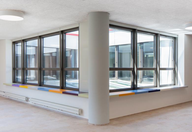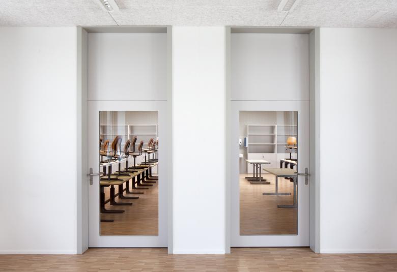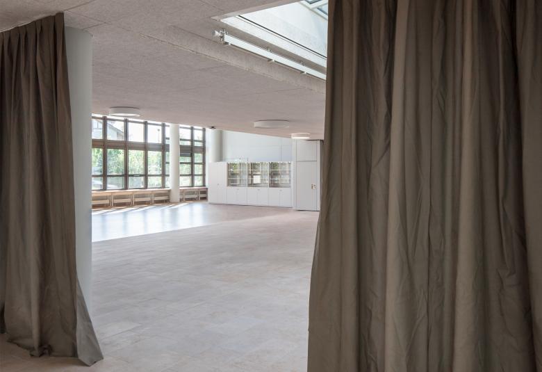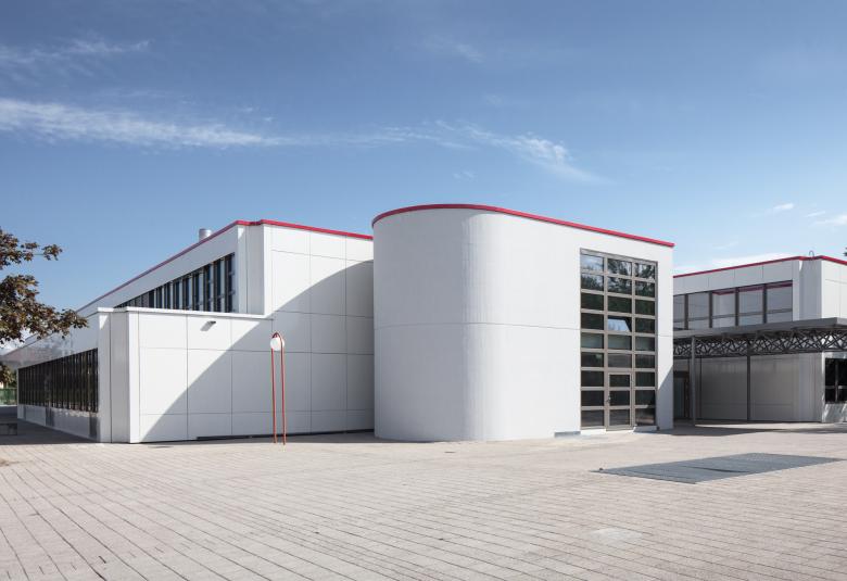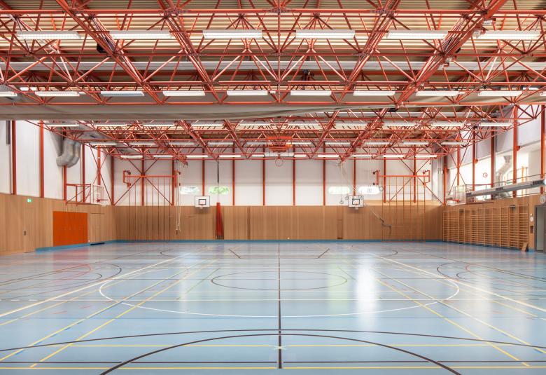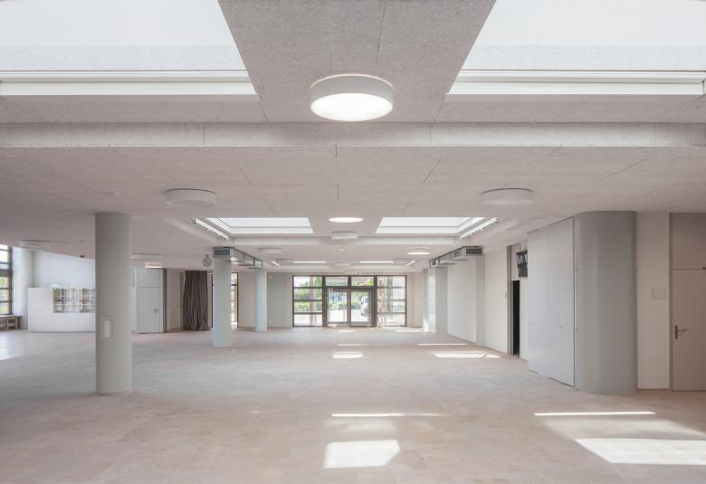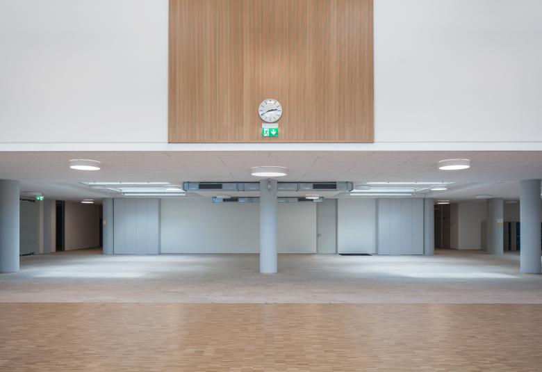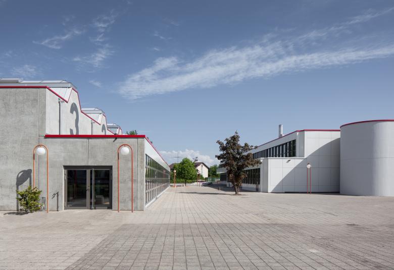 Das Kreisschule und die dazu gehörende Dreifachturnhalle aus dem Jahr 1974 der Architekten Burkhard Meyer Steiger wies beträchtliche Sicherheitsmängel auf und entsprach nicht mehr den aktuellen betrieblichen, bautechnischen, energetischen und pädagogischen Anforderungen. Die innere Organisation des Schulhauses mit den allgemeinen Räumen im Erdgeschoss und den Klassenzimmern im Obergeschoss blieb möglichst erhalten. Die Bedingung immer zwei Klassenzimmer mit einem Gruppenraum zu kombinieren, konnte für vier existierende Einheiten erfüllt werden. Über den bestehenden Lichthöfen wurden drei neue Gruppenräume asymemetrisch eingebaut, so dass die darunterliegende grosse Eingangshalle genügend und gleichmässiges Tageslicht aufweist. Zudem wurde auf dem Eingangsniveau ein grosszügiger Mittagstisch mit Küche konzipiert. Die bestehende Fassade wurde aufgrund energetischer Mängel neu gebaut. Die typische, feingliedrige Fenstereinteilung wurde zugunsten grosszügiger Fenster so ersetzt, dass das Raster und damit der Charakter des Gebäudes erhalten blieben. Zudem erinnert ein orangeroter Fries am Dach an die ursprüngliche, typische Farbe der 70er Jahre.