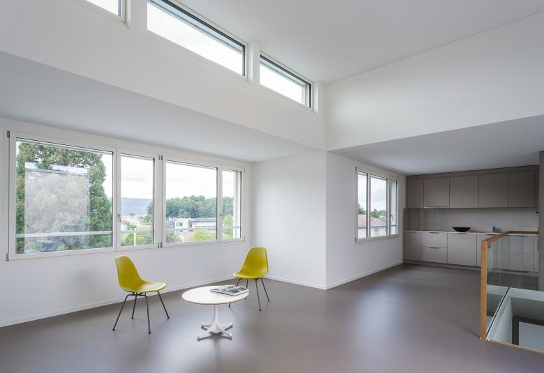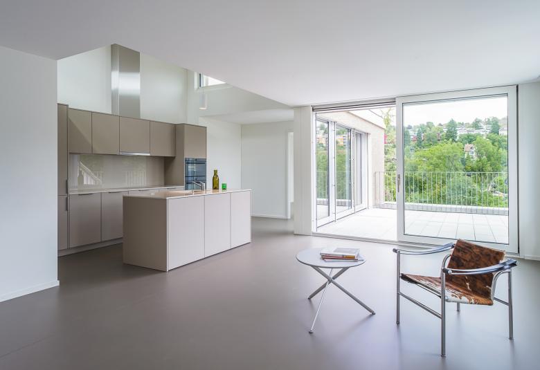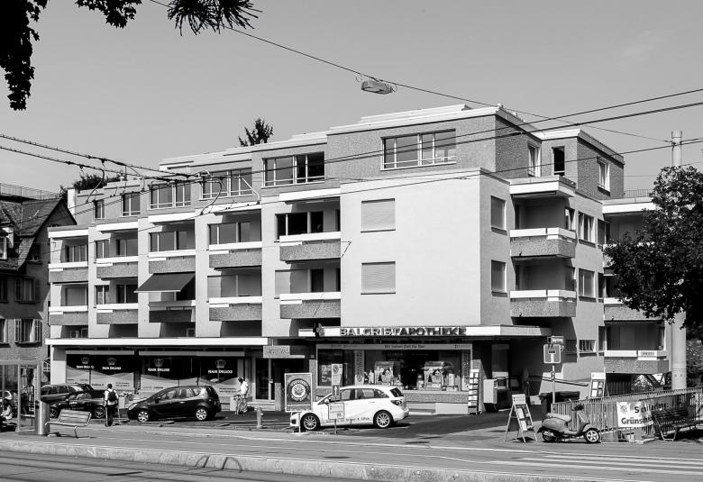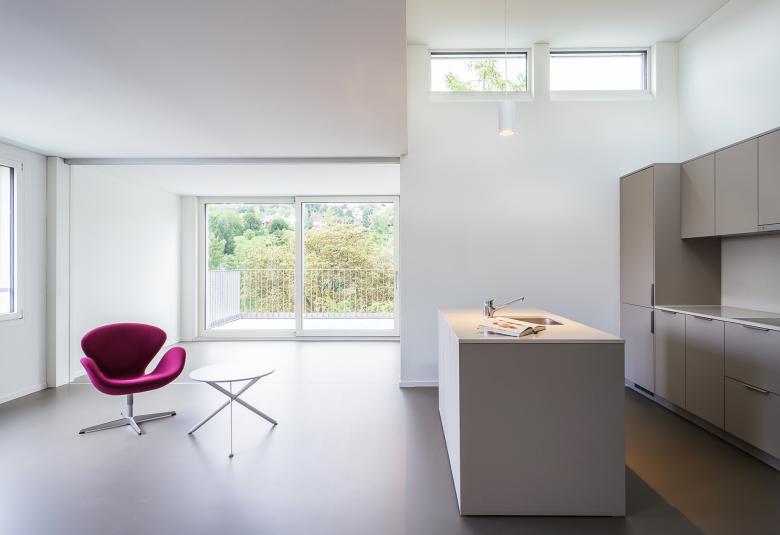 Das 1974 erbaute Gebäude liegt direkt an der verkehrsreichen Forchstrasse und ist aufgrund der Grundstücksform gestaffelt. Die Zustandsanalyse zeigte, dass die Gebäudehülle, alle Küchen und Badezimmer und die gesamte Gebäudetechnik veraltet und somit ersetzt werden mussten. Ebenfalls wurden Sicherheitsmängel im Brandschutz und den Brüstungshöhen festgestellt. Das Potential für eine eingeschossige Aufstockung war vorhanden. Um dieses wirtschaftlich auszuschöpfen, wurde die neue Attika mit dem darunterliegenden Geschoss verbunden und es entstanden acht attraktive Duplexwohnungen. Wegen der geografischen Ausrichtung nach Süden waren die Aussenräume zur Strasse wenig sinnvoll. Um jeder Einheit einen eigenen, ruhigen Aussenbereich zu schaffen, wurden die Atrien im Inneren und mit hofseitigen Terrassen gestaltet. Unterschiedliche Geschosshöhen lassen spannende Raumabfolgen entstehen und ermöglichen, dass direktes Sonnenlicht in die ganzen Wohnungen eindringen. Die 22 bestehenden Geschosswohnungen wurden im bewohnten Zustand umgebaut. Die gesamte Gebäudehülle wurde saniert, aufgefrischt und zeigt neu einen zeitgemässen Ausdruck mit klarer, klassischen Gliederung.