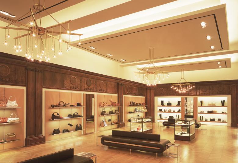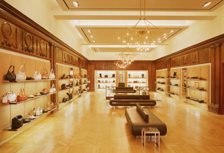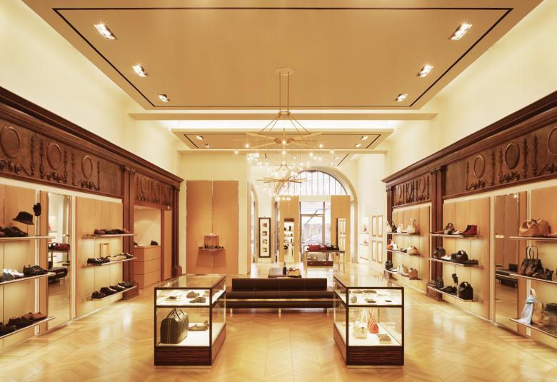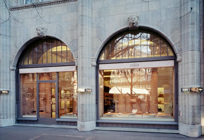 Beim umzubauenden Gebäude an der Bahnhofstrasse handelt es sich um eine geschlossene Blockrandbebauung, deren Innenräume unter Denkmalschutz stehen. Der neue Mieter aus Mailand, der seine exklusiven Schuhe und Handtaschen weltweit in eigenen Boutiquen vertreibt, legte grossen Wert auf das Corporate Design. So mussten edle Materialien wie ein Ahorn Holzboden, Wandverkleidungen aus Gips und Leder sowie Regale und Nischen aus Metall und Leder eingesetzt werden. Im Erdgeschoss befindet sich auf der ganzen Ebene die Verkaufsfläche und im Untergeschoss sind die Nebenräume und Lagerflächen. Das gesamte, neue Lichtkonzept konnte in das Projekt einfliessen. Die drei vorhandenen Messingleuchter aus den 30er Jahren blieben erhalten und wurden in die angepasste Lichtkomposition integriert. Die denkmalgeschützten Holztäfer an den Wänden wurden restauriert, in die neue Gestaltung eingepasst und somit deutlich aufgewertet. Sie bilden einen Kontrast zur neuen Architektur. Die zu erhaltenden Elemente erzeugen zusammen mit den neu gebauten, festen Teilen und der mobilen Ausstattung eine angenehme Stimmung und Atmosphäre.
