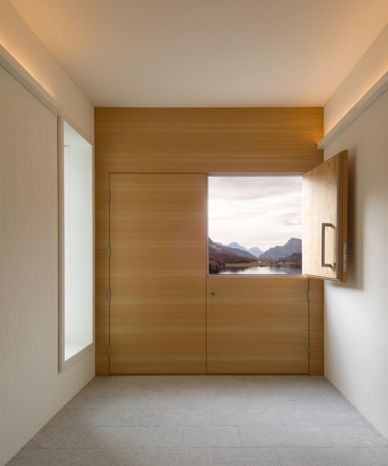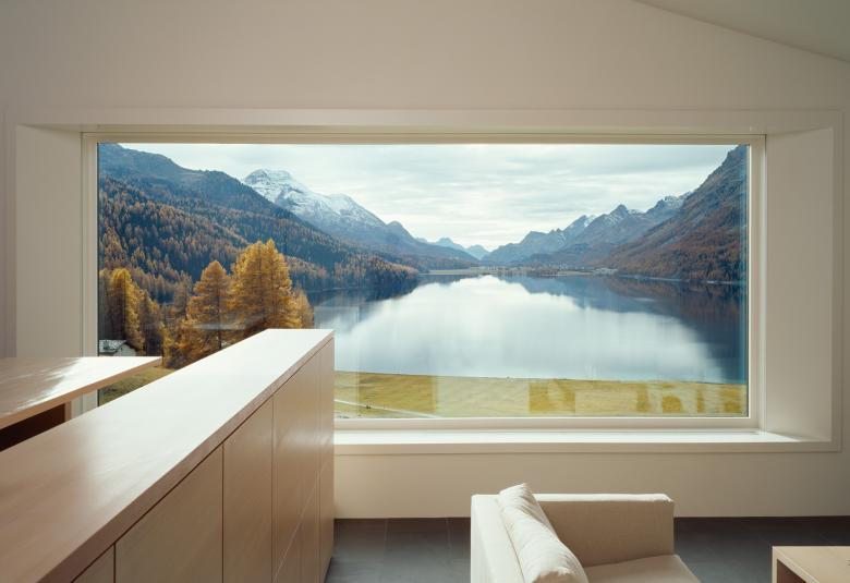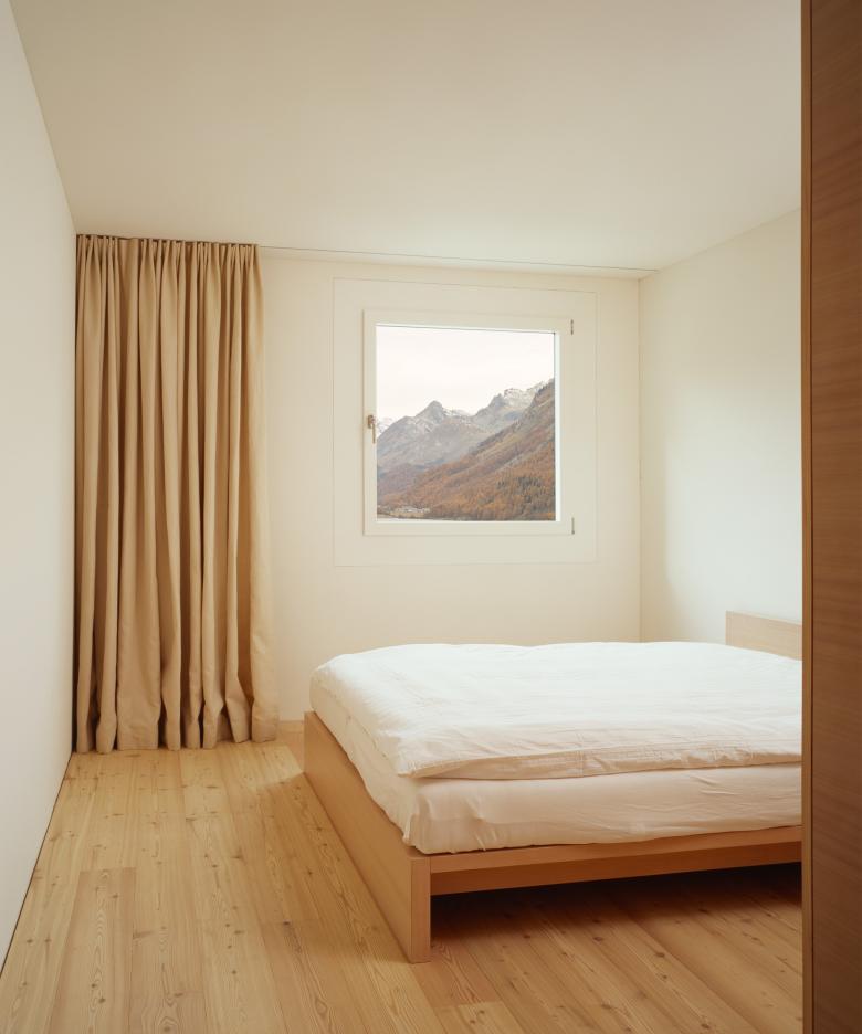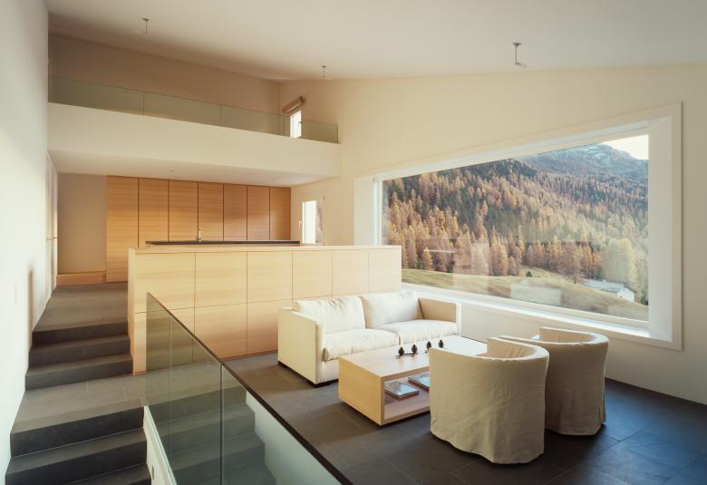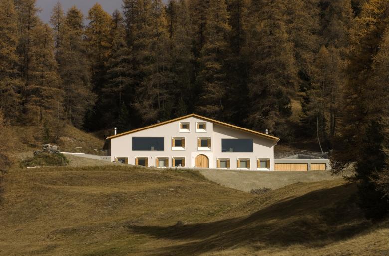 Das ursprüngliche Ferienhaus eignete sich nicht für die gleichzeitige Benützung zweier verschiedener Familien, sodass ein Neubau entstand. Die Liegenschaft befindet sich ausserhalb der Bauzone, an prominenter Lage. Dies hatte zur Folge, dass nur restriktive gestalterische Möglichkeiten bezüglich Ausnützung und Form erlaubt waren. Das Entwurfskonzept sah eine maximale Ausnützung auf zwei Wohn- und einem Galeriegeschoss vor sowie traditionelle und zeitgemässe architektonische Elemente zu kombinieren. Zudem wurden typische Elemente und Materialen aus der Gegend verwendet und neu interpretiert. Das mit Malenco Granit eingedeckte Dach als Elementbauweise ermöglichte im Innern einen stützenfreien Raum. Die Fenster wurden mit allseitig abgeschrägten, quadratischen, vorfabrizierten, fein strukturierten Betonelementen eingefasst. Die schlichte Fertigung der Fensterläden aus Lärchenholz sowie des Eingangtores erinnern an die traditionelle Bauweise. Der grosszügige Sulèr erschliesst die beiden Ferien- sowie die kleine Einliegerwohnung und dient als Ort der Ankunft. Um die einzigartige Aussicht einzufangen und innen eine helle Atmosphäre zu kreieren, wurde ein dominantes Panoramafenster gestaltet.