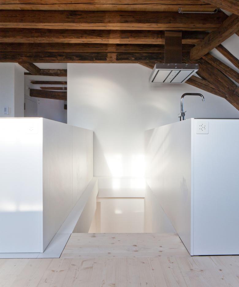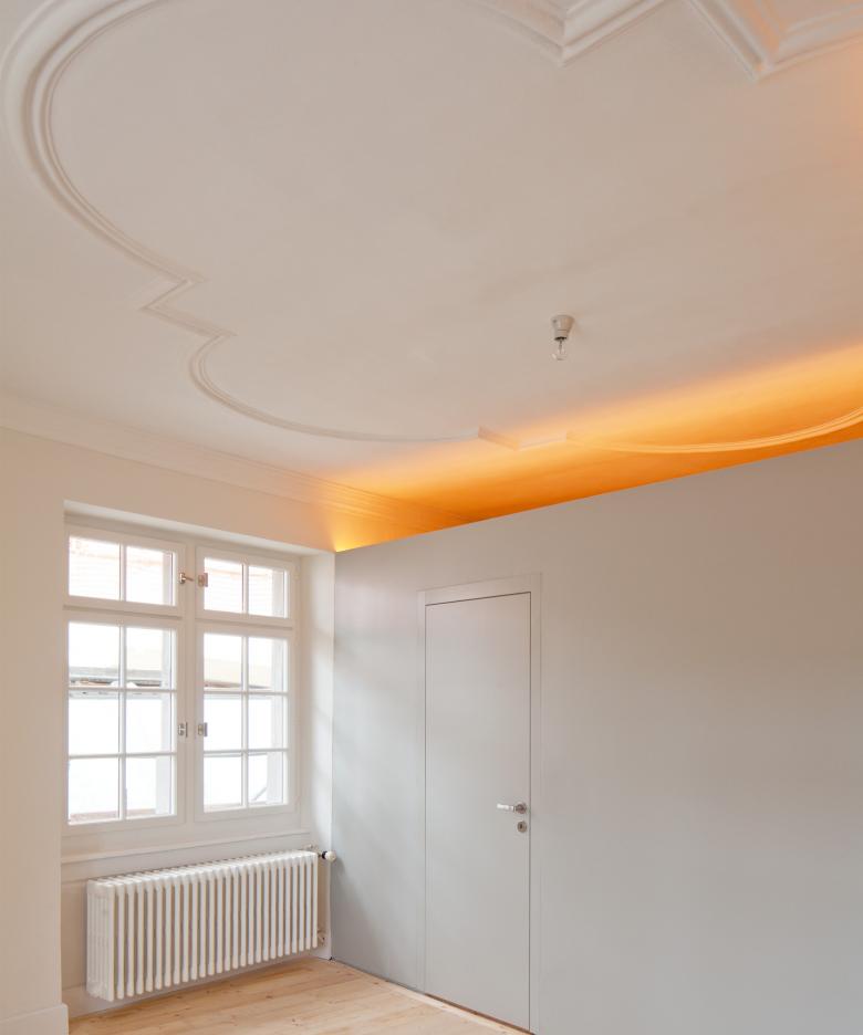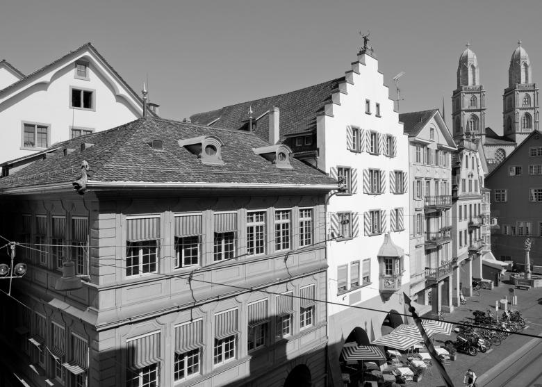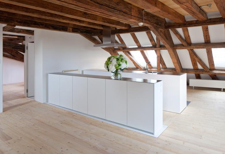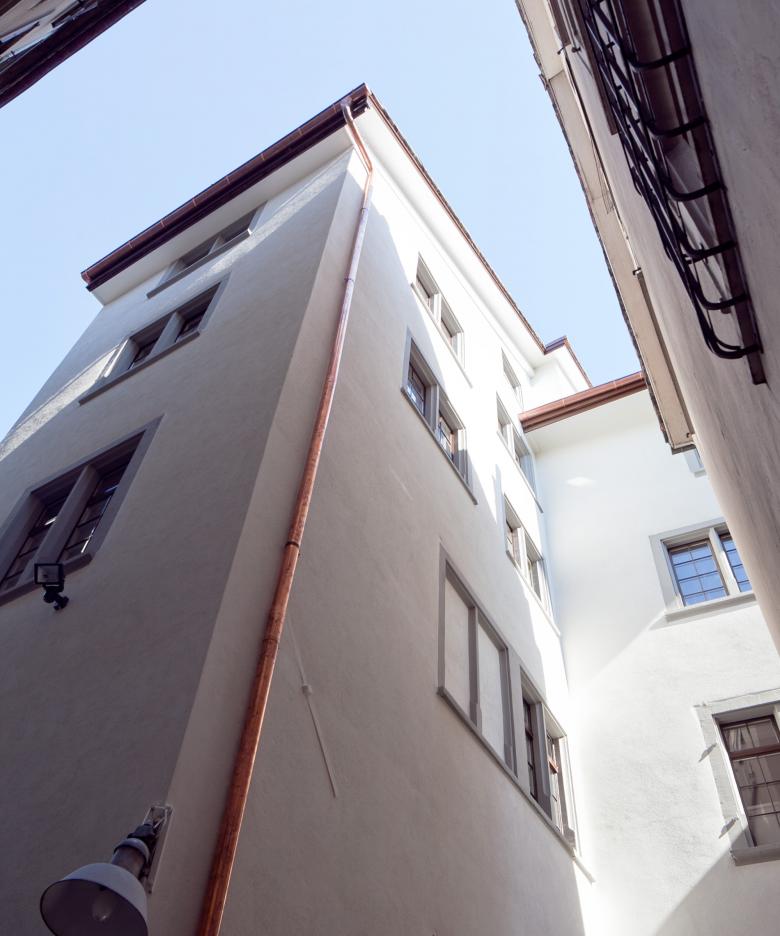 Das aus einem Vorder- und mehreren Hinterhäusern bestehende, denkmalgeschützte Zunfthaus zur Saffran musste bezüglich Brandschutz und baulichem Zustand saniert werden. Um gleichzeitig den Wert der Liegenschaft aufzuwerten und die Sicherheit zu verbessern, wurde eine neue Wohnung mit rund 190 m2 auf drei Geschossen eingebaut. Gleichzeitig wurde das Dach mit neuen Dachfenstern und Gauben sowie die Fassaden saniert. Bei dieser Sanierung, die in enger Zusammenarbeit mit der kantonalen Denkmalpflege erfolgte, handelt es sich um ein exemplarisches Beispiel, wie alte Bausubstanz und aktuelle Wohnbedürfnisse vereint werden können. Im Innern entstand eine lichtgraue Box mit den sanitären Räumen auf einem neuen, geölten Riemenboden aus Fichte, die die Deckenstukkaturen unberührt lässt. Die Küche bildet den Abschluss der neu interpretierten Treppenbrüstungen und unterteilt den Wohn-/ Essraum. Aussen wurde der Fassadenputz nach alter Rezeptur, in einem aufwändigen, mehrschichtigen Verfahren aufgetragen. Die defekten Sandstein Fenstereinfassungen wurden gereinigt und wo nötig plattiert. Die Holzfenster mit Ziehglas wurden in Anlehnung an die ursprünglichen, feingliedrigen Profile ersetzt.