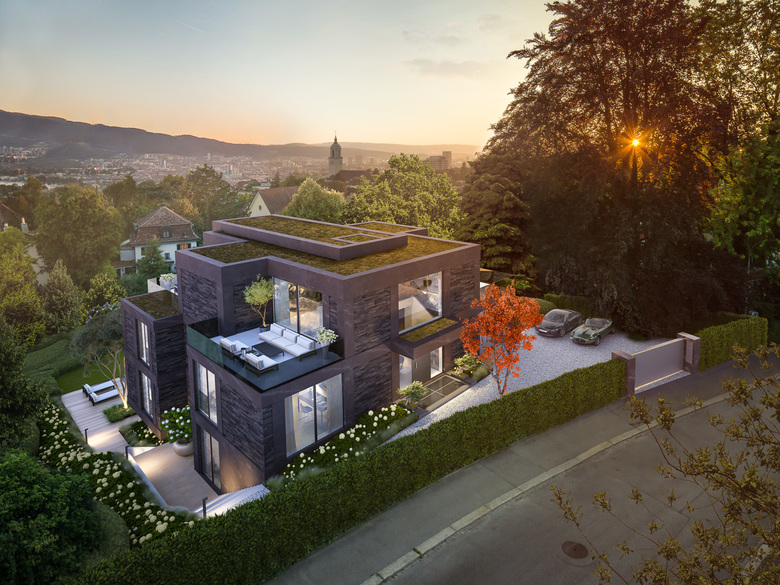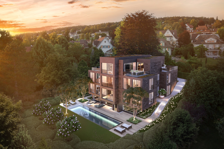 Ein vornehmes Wohnquartier am Zürichberg bildet den adäquaten Kontext für diesen Neubau einer herrschaftlichen Villa mit weit über 800m² Wohnfläche. Ihre Architektur soll sie einerseits in die Umgebung eingliedern, andererseits modern und zeitgemäss, aber auch zeitlos sein – das heisst, sich nicht einem kurzlebigen Trend unterwerfen. Besonderes Augenmerk galt der Funktion der Räume, weshalb der Baukörper von innen nach aussen entwickelt wurde. Bewusst ist beispielsweise eine klare Trennung zwischen Privat- und Gästebereich vorgesehen. Zu den Annehmlichkeiten der Villa zählen zwei Pools mit Wellnessbereich, aber auch ein bemerkenswertes Weinregal, das über zwei Stockwerke reicht. Das Zusammenspiel von Materialien, Farben und Formen schafft ein harmonisches Ganzes und vollendet dieses Objekt – ein vornehmes Unikat mit hoher architektonischer Identität.