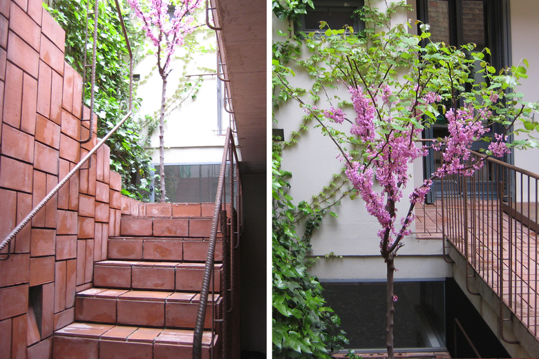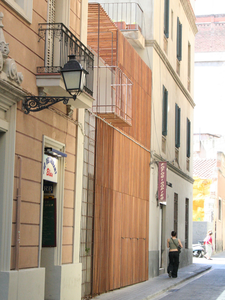 La disposición de la terraza del 1º piso libera al máximo un espacio de uso plurifuncional en continuidad con la vivienda. La piscina climatizada y la vegetación se sitúan al fondo, debajo de la medianera principal, consiguiendo la máxima profundidad. El límite de acero y madera dobla en forma de pérgola, se recoge el es¬pacio... y un pequeño balcón permite la relación puntual con la calle, donde un peatón se acerca a un cañizal de una antigua riera más que a un edificio de la ciudad.