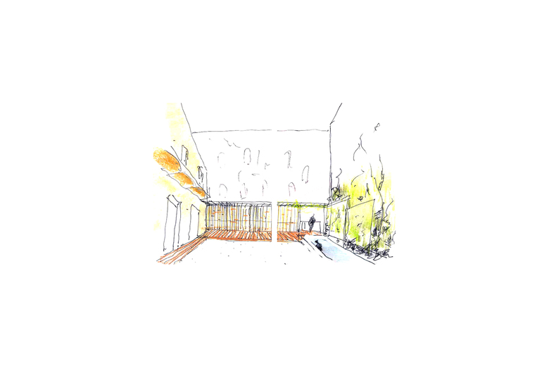 Una intención: a partir del vacío interior de manzana, un jardín se abre a la ciudad... En las dos plantas (baja/garaje + piso/terraza), prevalece la disposición en continuidad de los programas, así como la alternancia y relación entre ellos en los diferentes periodos del año. De esta manera, el garaje intenta optimizar al máximo su espacio consiguiendo una capacidad y movilidad óptima para dos vehículos. El acceso a la terraza se sitúa en el fondo de la parcela potenciando con la luz natural la continuidad entre la calle y el espacio jardín.