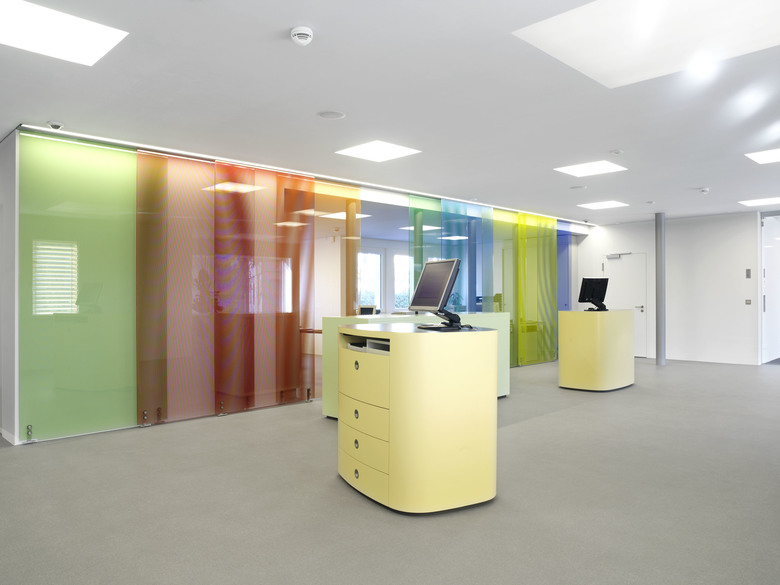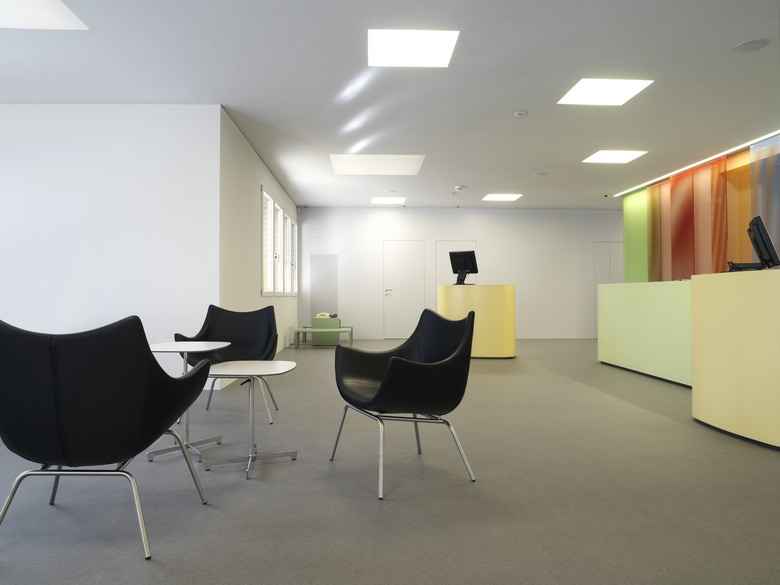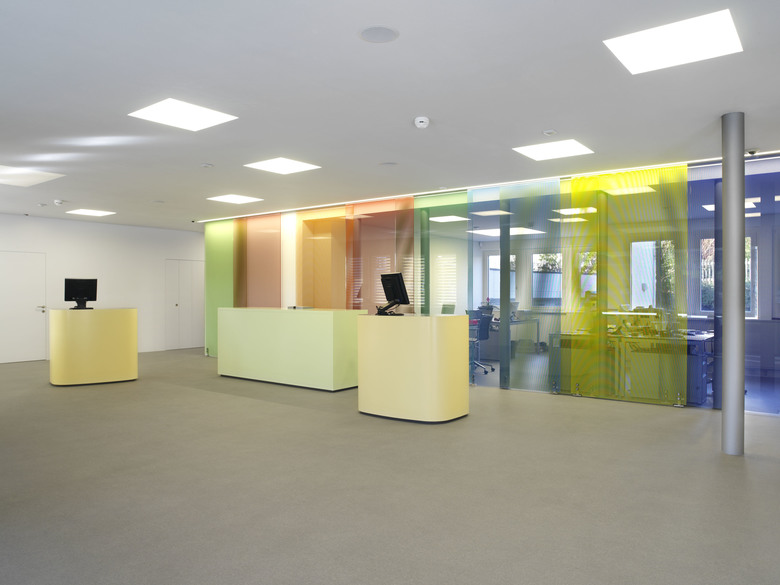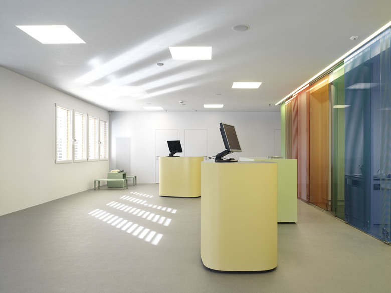 Im Erdgeschoss des Gebäudes wurde angestrebt, innerhalb vorgegebener Strukturen einen grosszügigen und flexibel nutzbaren Raum zu schaffen. Ein weiter offener Kundenbereich, architektonisch gestaltet durch verschiedenfarbig gestaltete Glas-Schiebeelemente und Beraterdesks verschafft der Kundenzone Grosszügigkeit, Klarheit und Übersichtlichkeit. Die Wegführung ist einfach, die angegliederten Nutzungsbereiche sind voneinander getrennt und - je nach Diskretionsanforderungen - vom Eingangsbereich abgerückt. Beratungs- und Arbeitsbüros befinden sich an gut belichteter Randlage. Die vom Künstler Charles Boetschi gestalteten halbtransparenten, farbigen Glasschiebewände bilden das zentrale Gestaltungselement. Durch freies Anordnen der einzelnen Scheiben lässt sich das Farbeindruck verändern und gleichzeitig die Trennung zwischen Kunden- und Arbeitsbereich entsprechend den wechselnden Bedürfnissen anpassen. Die beiden Beraterdesks der Stehberatung sind im Zentrum der Halle mit direktem Bezug zum Eingang platziert. Der flexible Innenraum dient als Gefäss wandelbarer Funktionen und Einrichtungen.