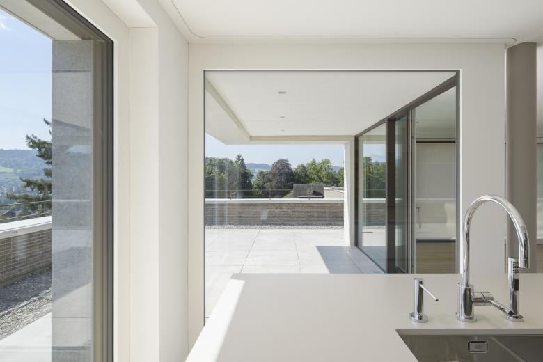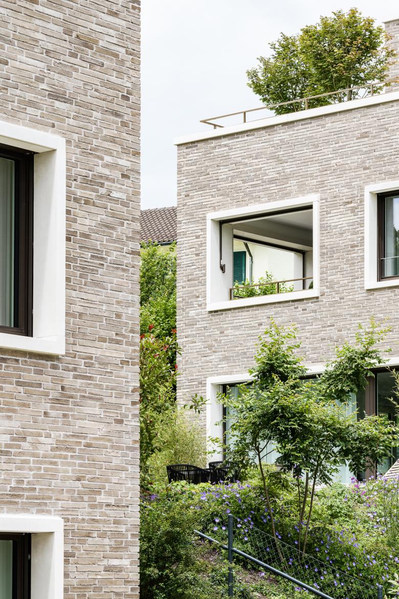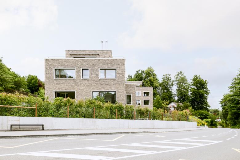 Durch die Grundstücksarrondierung und dem frei werdenden Parkplatzbereich der Strassenparzelle entsteht ein neues Baufeld. Mit der Überbauung Sonnenhaldenstrasse sind zwei Neubauten geplant, die sich mit einem quartiersüblichen Strassenabstand an der Goethestrasse orientieren. Im südlichen Bereich ist das private Einfamilienhaus, im nördlichen Bereich ein Mehrfamilienhaus mit sechs Eigentumswohnungen geplant. Die beiden Bauten sind durch die gemeinsame Tiefgarage miteinander verbunden, deren Einfahrt von der Sonnenhaldenstrasse erfolgt. Die Neubauten werden in Massivbauweise mit einer hinterlüfteten Klinkerfassade in erdigen Farbtönen erstellt. Der grosse Garten wird durch eine Bepflanzung mit Sträuchern zur Strasse abgeschlossen. Die durchfliessende Landschaft bettet die beiden Punktbauten in den Grünraum ein so, dass die Volumen im Strassenbild zurücktreten.