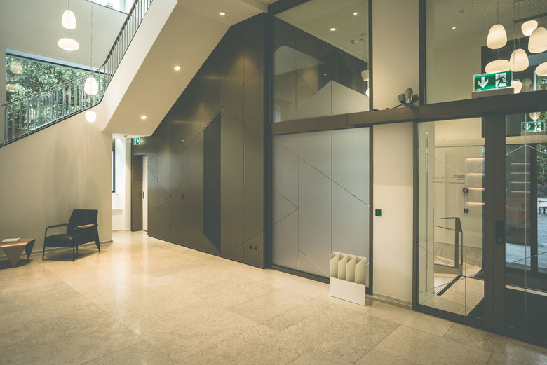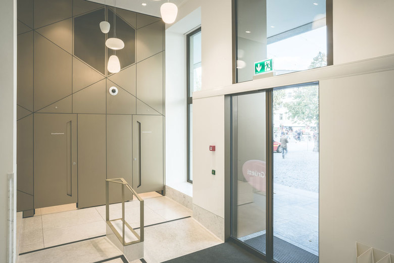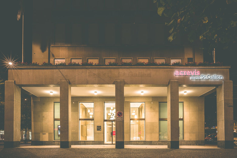 Der Hauptsitz der Regionalbank acrevis ist am zentralsten Punkt in der Innenstadt der Stadt St.Gallen zu Hause. Der Umbau der Kundenhalle ersetzt die in die Jahre gekommene und auch betrieblich veraltete Schalterhalle aus dem Jahre 1984 und repräsentiert die Bank neu durch offene, mit Tageslicht durchflutete und transparente Räume. Die Verschiebung des Haupteinganges zur Arkadenmitte und des Zwischengeschosses in den westlichen Teil des Erdgeschosses ermöglicht eine grosszügige, rollstuhlgängige Eingangssituation mit separater 24h-Zone. Die tragende Bausubstanz von 1935 bleibt dabei unangetastet. Wertige Schaltermöbel in der überhohen, hellen Halle erlauben eine schrankenlose Begegnung von Bankmitarbeitenden und Kunden. Im normalgeschossigen Bereich unter dem neuen Zwischengeschoss finden sich Wartebereich, drei Sitzungszimmer für Beratungen und das Back Office mit Diskretschalter. Im Zwischengeschoss sind die Arbeitsplätze der Kundenberater sowie WC‘s, Küche und ein Besprechungszimmer untergebracht. Kunden- und interne Bereiche im UG werden renoviert und ein IV-WC eingebaut. Die Erneuerung der gesamten Haustechnik geschieht bei laufendem Betrieb. Als Ersatz für die Kundenhalle dient während der Bauzeit ein Banken-Provisorium auf der Nordseite. Alle Büro‘s in den Obergeschossen erhalten zudem neu eine Kühlung.