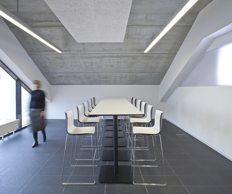 die entscheidung fiel zugunsten eines sanierungskonzeptes, in dem die wesentlichen strukturen des baukörpers beibehalten und, wo notwendig, sinngemäß weitergeführt wurden. die ästhetik der bestehenden vertikal rillenförmig strukturierten sichtbetonfassade wurde in eine gedämmte stegplattenkonstruktion übersetzt, doppelböden nehmen neue rohrleitungen und verkabelungen auf und sichern dadurch die möglichkeit einer flexiblen gestaltung der arbeitsplätze. die vormaligen zellenbüros wurden zu einem strukturiert zonierten kombibüro. über allem bringt ein durchgehendes oberlichtband ausreichend tageslicht auch in die tiefe gebäudemitte.