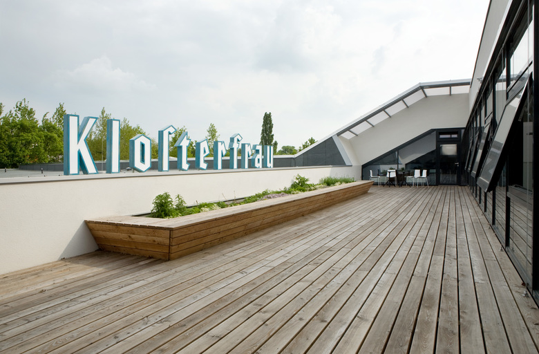 die vollkommen verwachsenen freiräume wurden neu gestaltet und mit sitzmöglichkeiten versehen. parkplätze wurden verlegt um den mitarbeitern pausen im sonnigen vorgarten zu ermöglichen. im ersten stock lässt jetzt eine großzügige dachterrasse den blick auf einen neu angelegten kräutergarten fallen und auf die liebevoll sanierten leuchtbuchstaben des alten firmenschriftzugs.