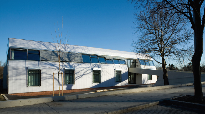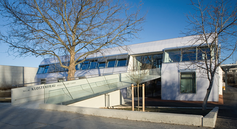 die anbindung des tieferliegenden baukörpers an die straße wurde durch eine rampenanlage gelöst. vom gehsteig gelangt man direkt zu den beiden haupteingängen der firmen klosterfrau und deren tochter maria galland, welche auf unterschiedlichen ebenen untergebracht sind.
