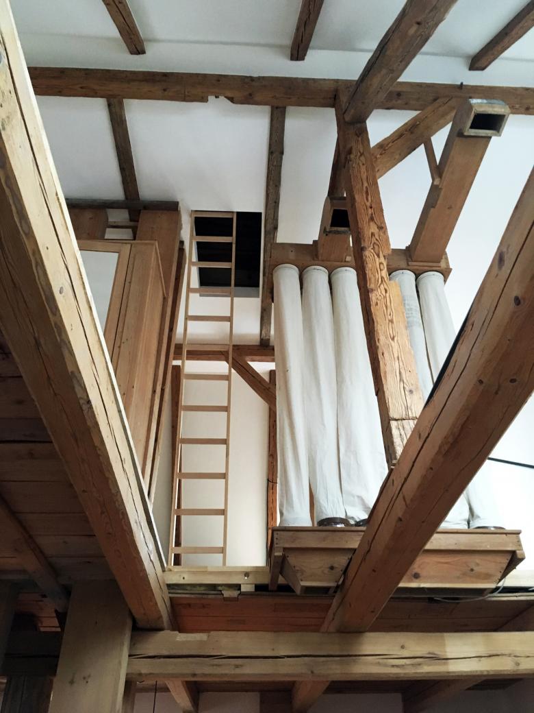 die holzkonstruktion der zwischendecken und des dachstuhls hingegen hatte die bisherige lebensdauer hervorragend überstanden und mußte nur an wenigen stellen für den neuen ausbau ertüchtigt werden. daher konnte sie in großem umfang sichtbar bleiben.