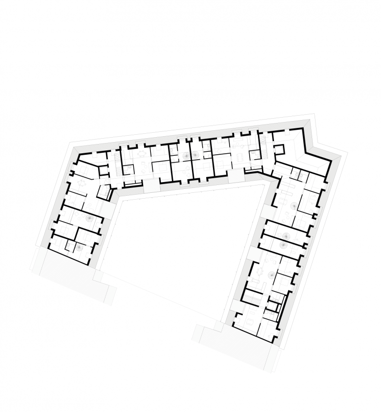 Entsprechend dem bestehenden Gestaltungsplan wird die Blockrandbebauung mit dem neuen Volumen komplettiert. Dieses vermittelt städtebaulich zwischen den angrenzenden historischen Baustrukturen hin zur Pauluskirche, zu seinem neuzeitlichen Gegenüber und zu der strassenbegleitenden Zeilenbebauung aus den 60er-Jahren. Auf der repräsentativeren Strassenseite schafft eine rückspringende Ecksituation im neuen Volumen eine Platzsituation, die den Auftakt des Strassenraumes und die öffentliche Erdgeschossnutzung auszeichnet.