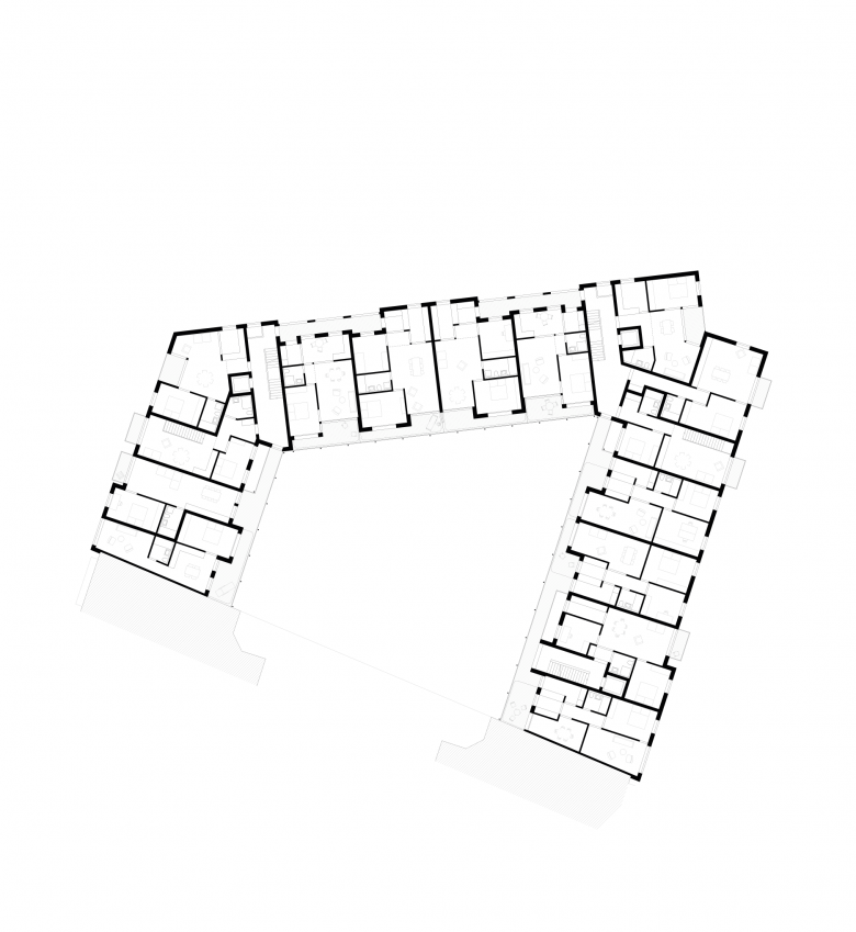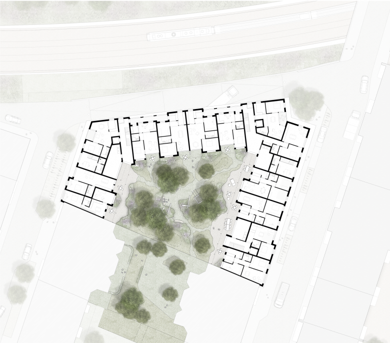 Für das neue Wohn- und Geschäftsgebäude wurde ein Wohnkonzept entworfen, dass dem Bewohner sowohl gesellschaftliche Komponente bietet aber auch dem Wunsch nach Privatsphäre und Individualisierung Rechnung trägt. Die geschickte Integration von gesellschaftlichen Elementen wird in der Wohnungserschliessung und den Aussenräumen auf vielfältige Art und Weise zum Thema gemacht. Typologisch sind die Wohnungen über eine Laube erschlossen und folgen dem Prinzip des Durchwohnens. Die privaten Aussenräume auf der Laube können mit Vorhängen zoniert werden, sind gleichzeitig Sonnen- und auch Sichtschutz und beleben die Hoffassaden mit einem Farbenspiel. Die dem Projekt zugrundeliegende Typologie schafft eine urbane Dichte und eine gelebte Nachbarschaft. Im Ausdruck orientiert sich das Projekt an den klassischen Konventionen der Blockrandbebauung. Die Fassade gegen aussen ist repräsentativ und gegen den Innenhof wohnlich gestaltet. Diese Unterschiedlichkeit der beiden Welten wird im Projekt durch den durchgrünten naturnah gestalteten Innenhof gestärkt.