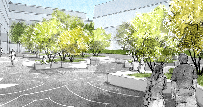 In einer sich öffnenden Geste formuliert die neue Fußgängerpassage zwischen dem „Katharinengraben“ und der „Holzwerft“ im Eingangsbereich des Bürogebäudes einen repräsentativen, öffentlichen Platz. Einladend breitet sich ein durch ein Messingband eingefasster „Teppich“ aus Natursteinplatten auf der Platzfläche aus. Die räumliche Differenzierung zum halböffentlichen Bereich des grüngeprägten „Gartenhofes“ wird durch eine Geländemodellierung erreicht. Im Innenhof bilden die Pflanzinseln in Blütenform einen spielerischen Kontrast zur ansonsten geradlinigen Architektur. Die breite Einfassung der Inseln bietet zudem Sitzfläche und lädt so zum Verweilen ein. Insgesamt entsteht im Innenhof der neuen Gebäude am Weichserhof eine offene, kommunikative und urbane Atmosphäre.