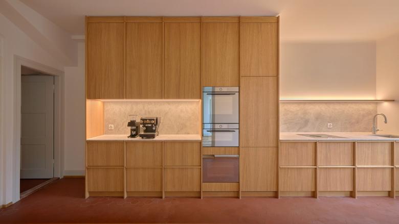 Three key areas defined the heart of the renovation: the kitchen and the two bathrooms. A minimalist design approach was adopted throughout, emphasizing clean lines and simplicity. Exquisite materials—particularly timber—were carefully selected to create a refined, elegant atmosphere that complements the building’s historic charm.