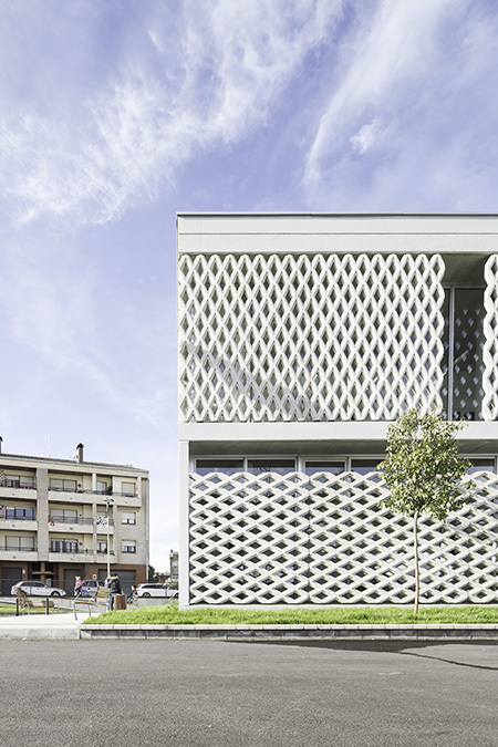 The building forms a compact low rise volume. Its facade is made of two prefab elements: a concrete lattice for the translucent parts and some GRC panels for the blind parts. The lattice was fabricated with one purpose made large size mould and has been installed either, horizontally or vertically, as to add variety to the facade by just one standard constructive element. This lattice assures privacy as well as solar protection in exposed areas. Above all, it acts as guarantor for giving a vibrant and everchanging visual effect. According to change and angle of daylight the industrialized prefab concrete building turns into a kind, warm and comfortable building.