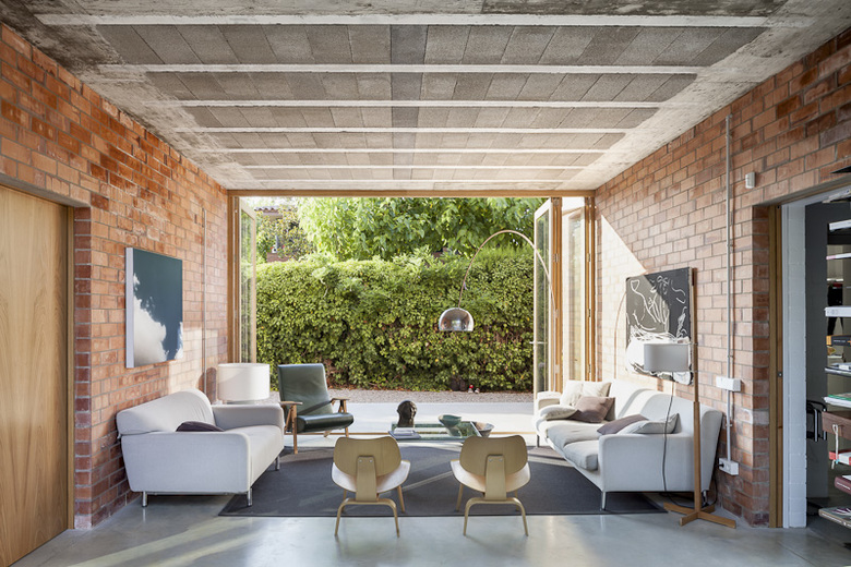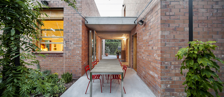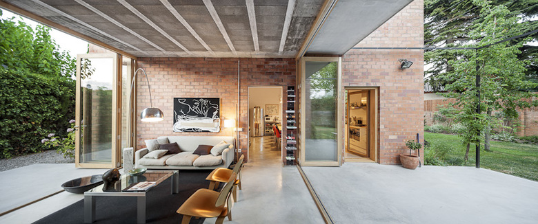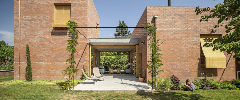 The spaces created between the three boxes are covered sheltering two different environments, open to the garden in north-south direction and can be closed with big folding windows. These spaces offer a very different atmosphere, much more related to the garden area than to the house. The first of these interstitial ambiences, between the children's area and the kitchen, serves as entrance hall. The second one, bigger, between the parents’ zone and the kitchen, is the living room but not a conventional one: a green house during winter and a fresh porch in summer.