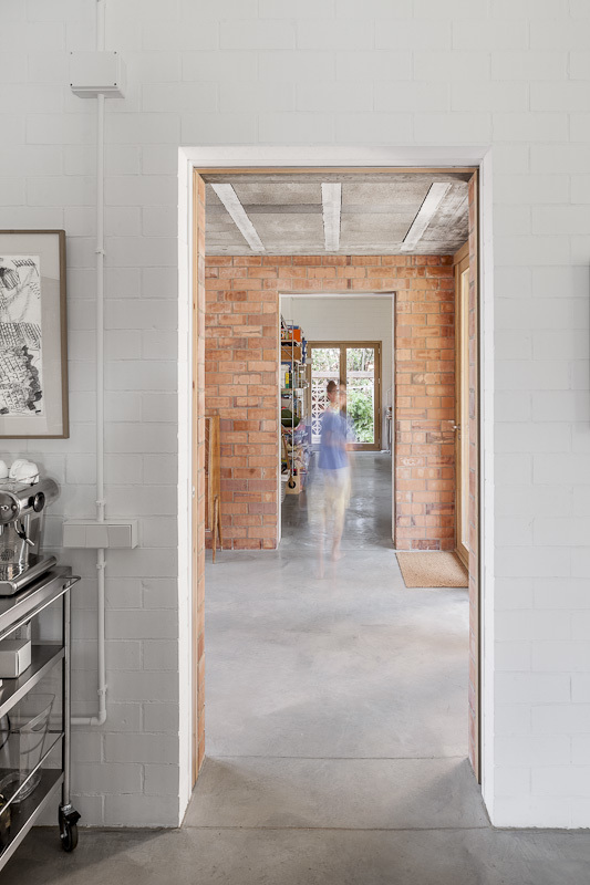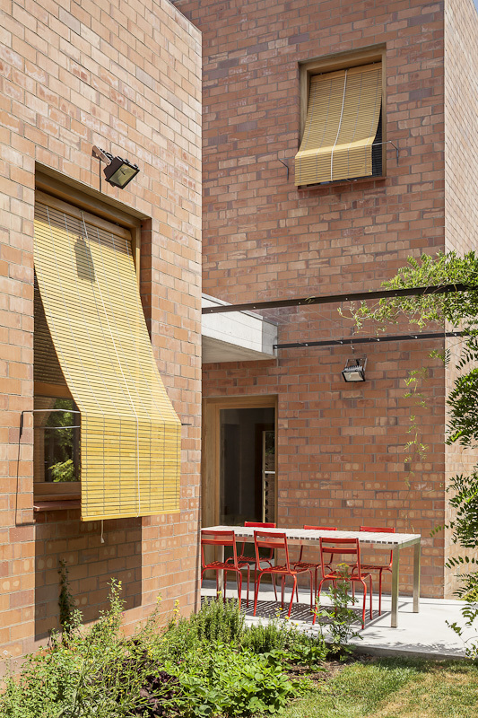 According to its materiality, the house is built on double face brick load-bearing walls, using red masonry for the outer face while white painted inside; wooden window and door frames with traditional outer roller blinds as sunscreen when required.