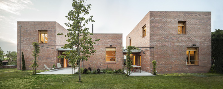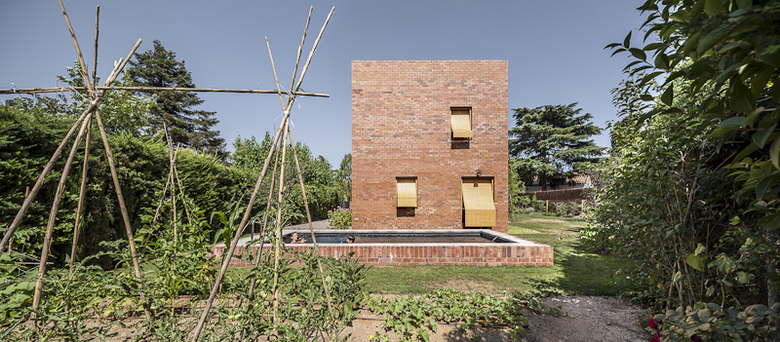About volumes, the house is composed of three brick masonry cubes of different heights set parallel to the back street. Although having several dimension windows that depend on their function, the cubes are predominantly massive. Besides, the interstitial areas between cubes, covered by a concrete slab and framed by folding wooden glass doors, are essentially ethereal. Actually, the space becomes an open porch when windows are folded back.