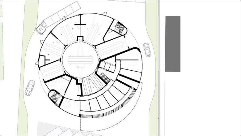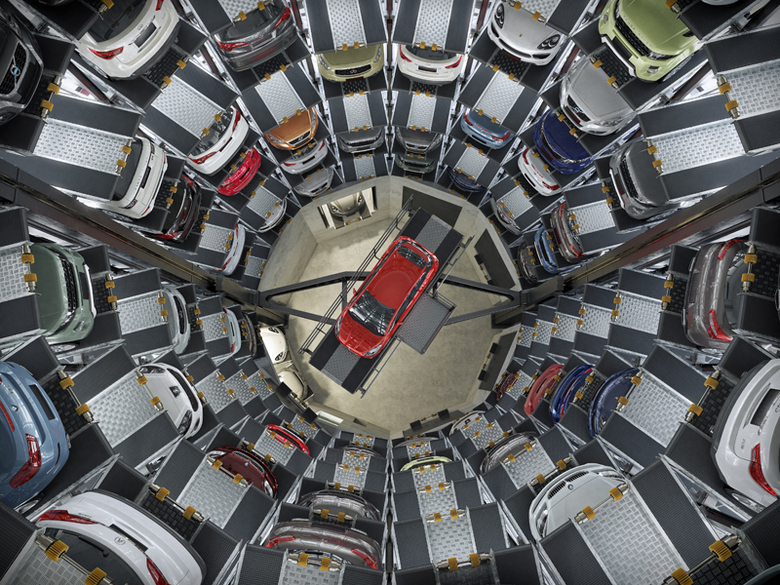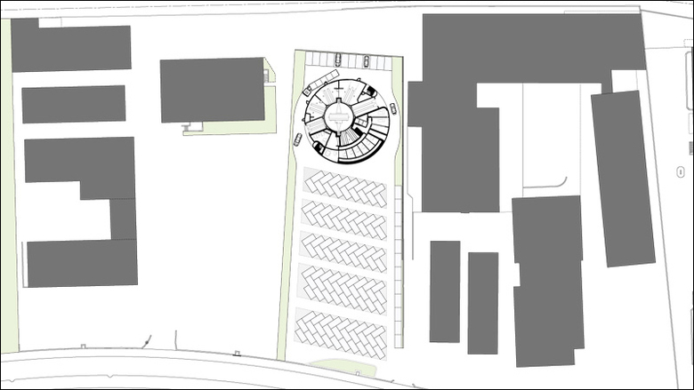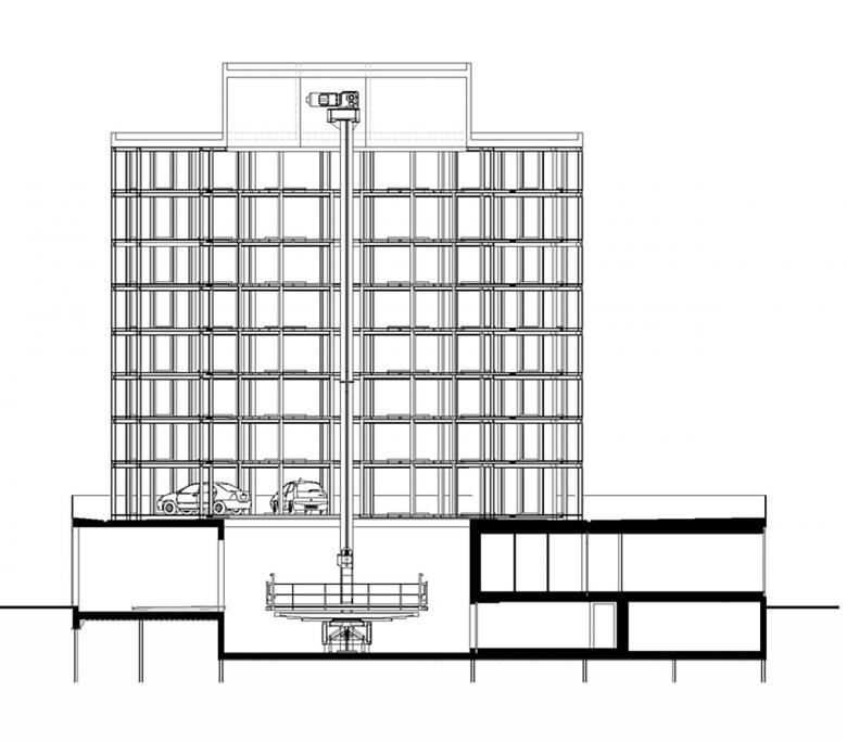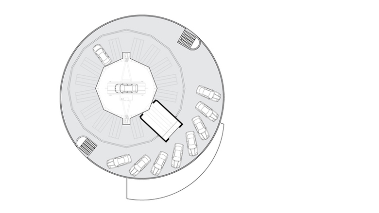 Die westliche Einfallsachse von Zürich ist geprägt vom Autohandel. Damit das Grundstück der „auto züri west“ effizienter genutzt werden kann, wird ein neuartiges, vollautomatisiertes Parkhaus gebaut. Das als Stahlbau konzipierte Parkhaus steht auf einem massiven Sockelgeschoss in welchem die Administration, eine Waschanlage, ein Showroom und eine Autowerkstatt eingeschrieben sind. Der wie ein Hochregallager funktionierende „Autosilo“ steht Exzentrisch auf dem runden Sockelbau, welcher tektonische Analogien zur Tankstellenarchitektur der Fünfzigerjahre aufweist. Die Formensprache der gesamten Anlage steht unter der Maxime des Automobils und dessen bequemen und effizienten Manövrierbarkeit.