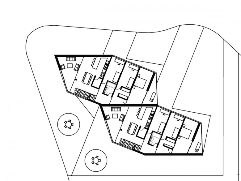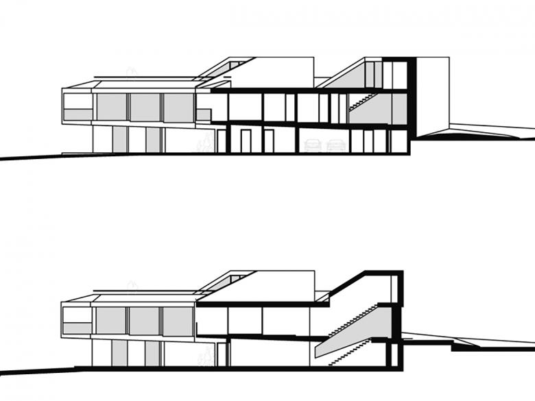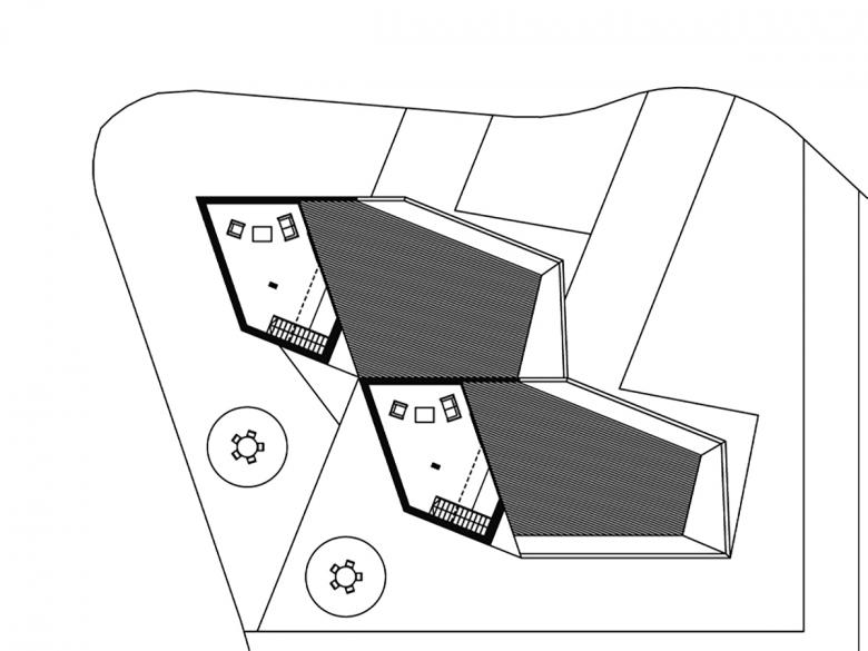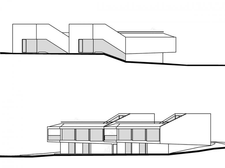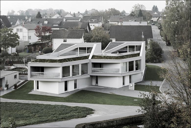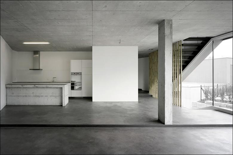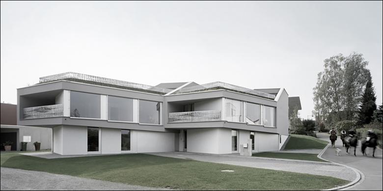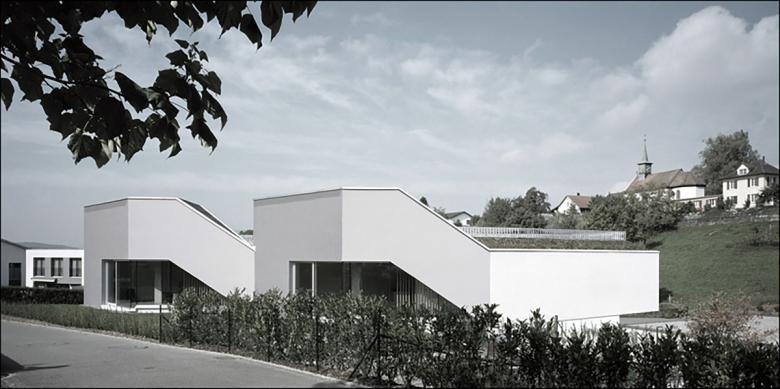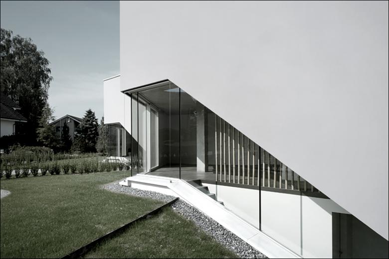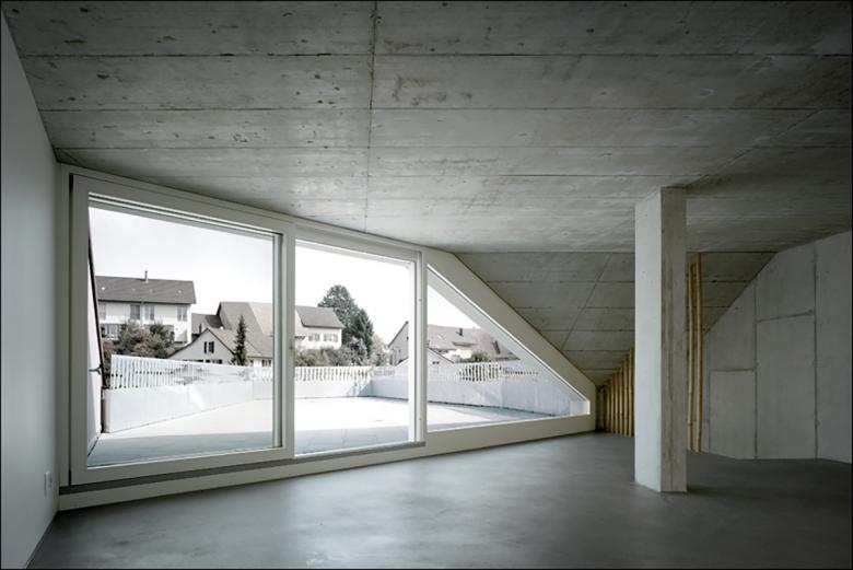 Realisiert 2006 - 2007. Der poligonale Grundriss entwickelt sich aus den örtlichen Gegebenheiten. Janusköpfig verfügt der Baukörper über zwei Hauptwohnrichtungen womit die örtliche Qualitäten wie Sonnengang und Aussicht vollumfänglich einbezogen werden.Das schwach nach Norden geneigte Grundstück wird von der Nordseite erschlossen. Der Zugang ist somit an der teifsten Stelle der Parzelle und führt über das nur teilweise in die Topographie eingelassene Erdgeschoss, in welchem eine Doppelgarage, ein Gästezimmer, ein Büro, sowie die Kellerräume eingeschrieben sind. Eine einläufige Treppe, welche in der Fassade tief eingeschmitten ist, führt in das Obergeschoss, in welchem drei Schlafzimmer, die Küche und der Wohn- Essraum organisiert sind. Über eine Stahltreppe gelangt man in die Lounge und auf die Dachterrasse.Durch eine Kaskadenartige Deckenkonstruktion wird eine progressive Raumhöhenentwicklung erzielt. Während die Schlafzimmer normale Raumhöhen von 2.4 - 2.6 Meter erreichen, weisen die Ess- und Wohnbereiche Raumhöhen von 2.7 Meter auf.Die Statik erfolgt über zwei Wandscheiben und einen tragenden Kern, was eine weitgehend offene Gestaltung des Baukörpers ermöglicht.