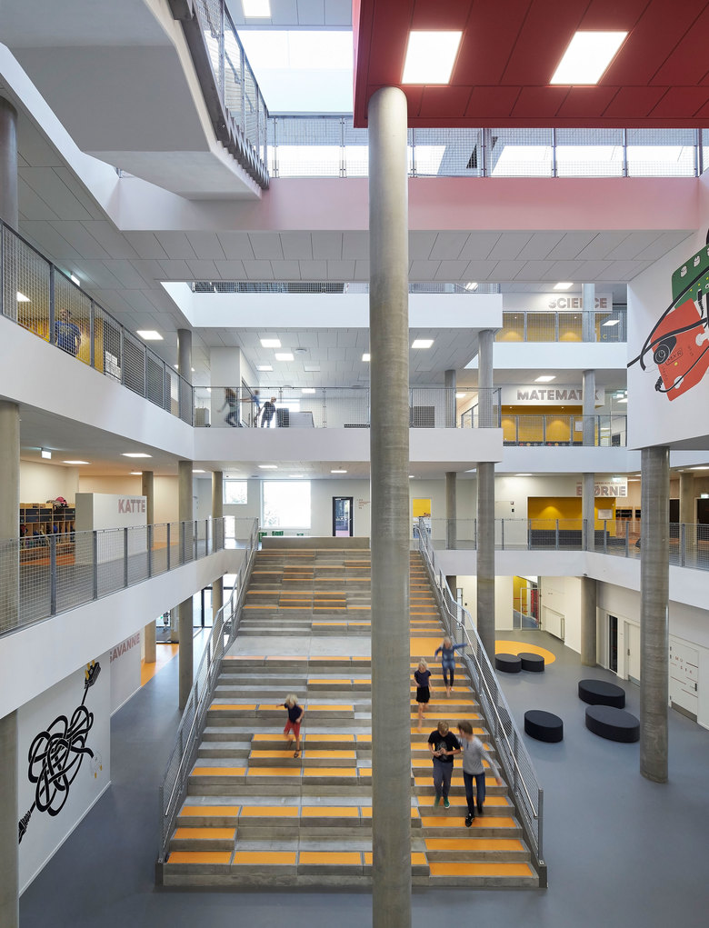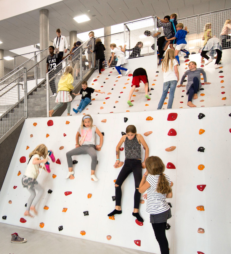 Frederiksbjerg School represents an innovative approach to school architecture in Denmark. It is one of the first schools designed to meet the requirements of the National Danish Reform of Public Schools, implemented in 2014. A key element of the reform is that children should get more exercise during the school day. At Frederiksbjerg School, children are encouraged to be physically active throughout the day. By means of climbing stairs, Tarzan tracks, and playgrounds, the children’s journey from A to B is designed to be a fun physical challenge. Customized zones for presentations, group work, and individual studies support the educational and didactic principles of the school. Physical activity is inevitable at Frederiksbjerg School. The results are better learning and higher test scores.