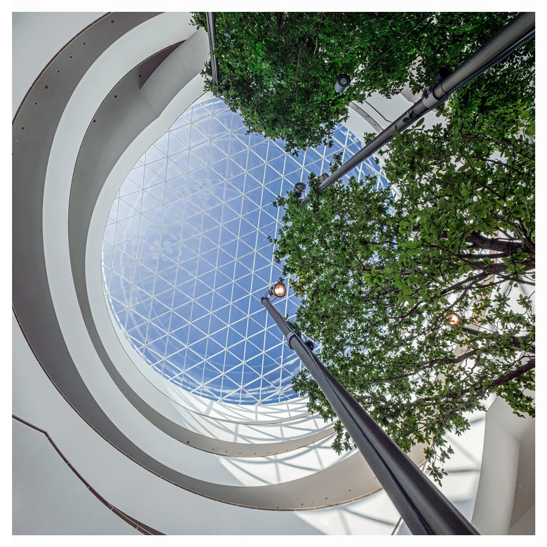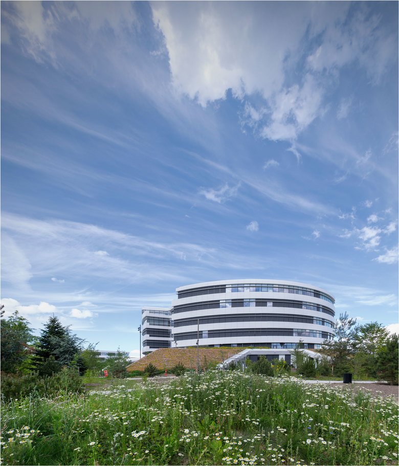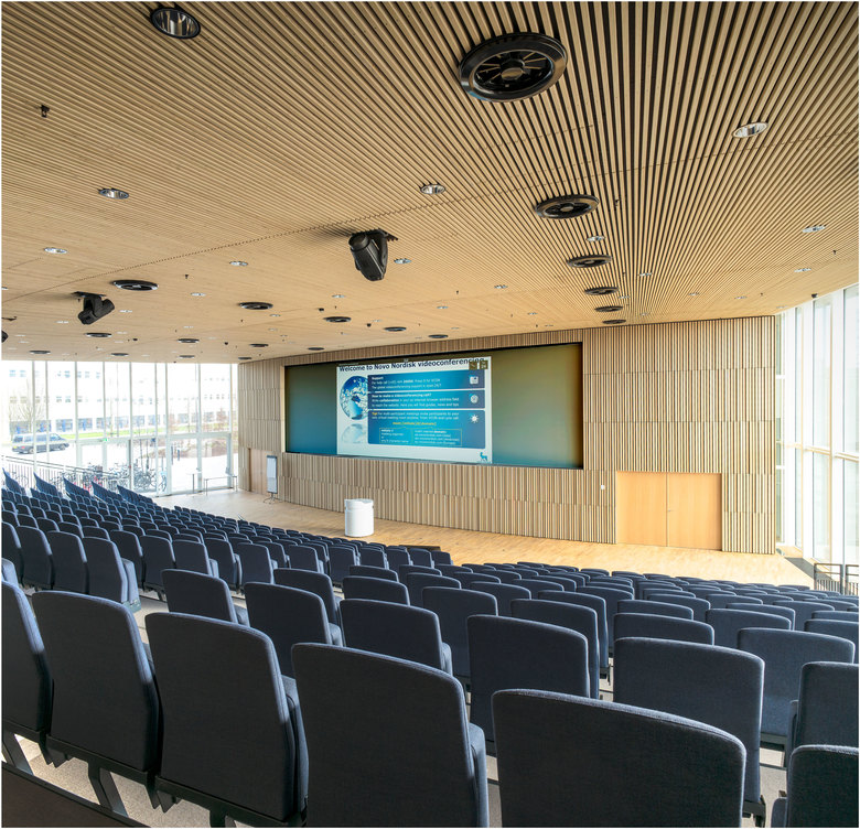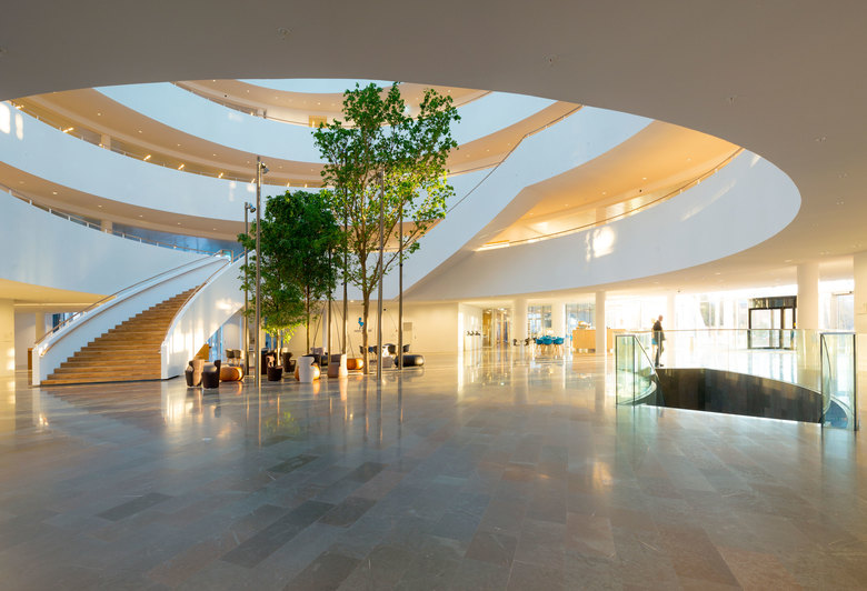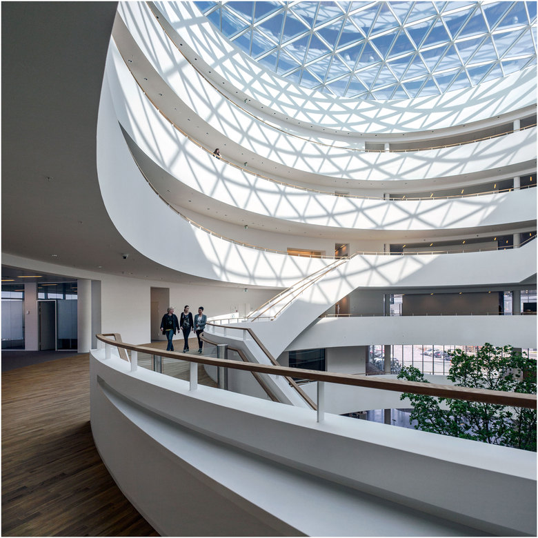 Novo Nordisk is synonymous with global leadership and innovation within the treatment of diabetes. The new Corporate Center is designed in a circular shape, which gives employees and management the feeling of being connected to their surroundings. A spiral staircase winds through the building, from the foyer at ground level to the executive offices at the top floor. A spectacular skylight allows views to the sky and casts natural daylight into the entire atrium space. Our choice of sustainable materials, mainly from Scandinavia, contributes to a healthy indoor climate and work environment. Located in a green park in the heart of the Novo Campus, the headquarters provides a distinctive, sustainable setting for the daily work of staff and management.