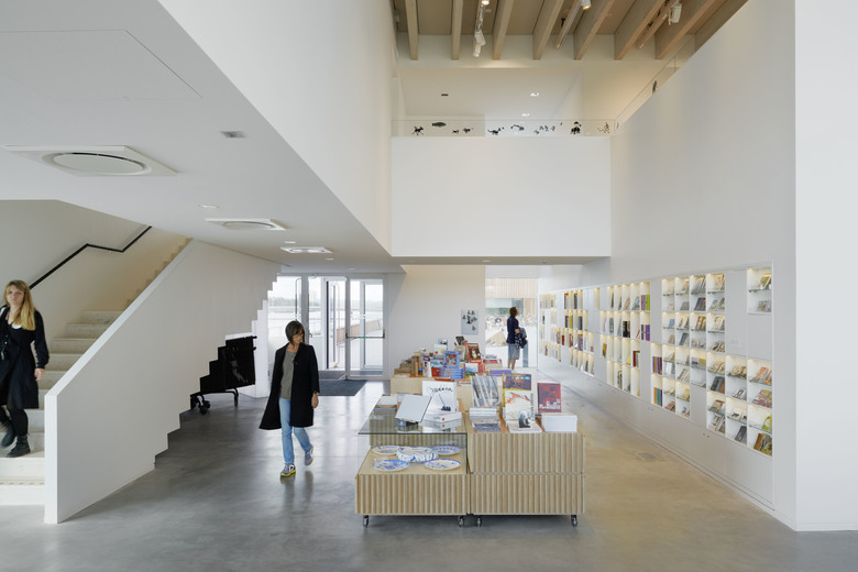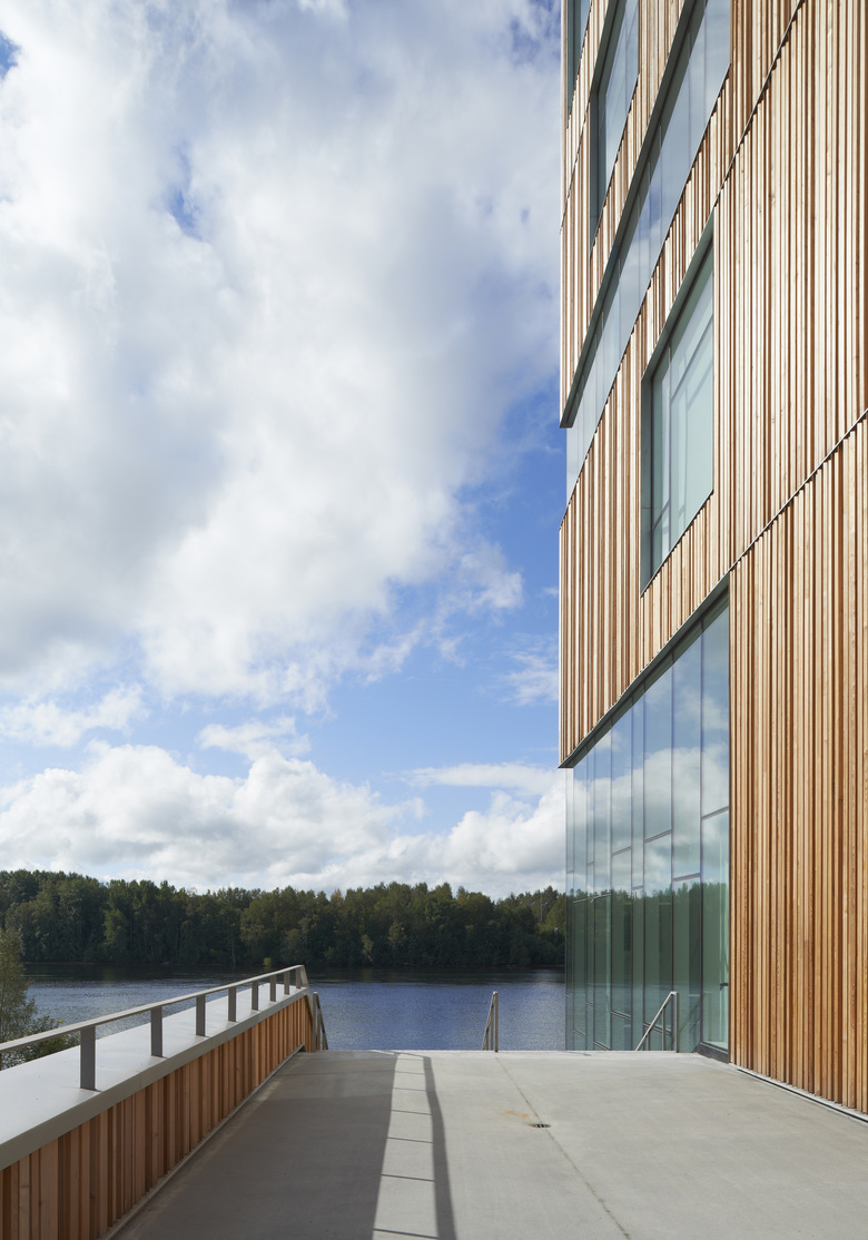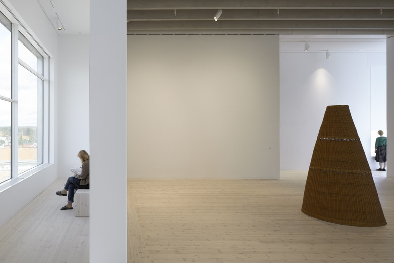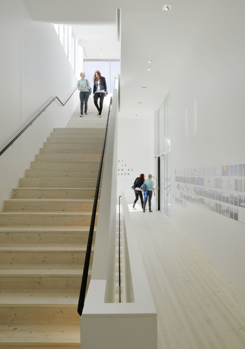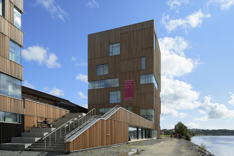 The tower comprises three exhibition halls placed upon each other - with inserted floor plans featuring the auditorium, children’s workshops and administration. The large, square exhibition halls are free from structural elements and offer ample daylight, let in through niches in the facade. This creates a vibrant and dynamic framework for the various exhibitions. As the other buildings at the Arts Campus, the facade features vertical louvre panelling in Siberian larch, which supports the verticality of the building - only broken by the large windows and the glass floor in the middle.