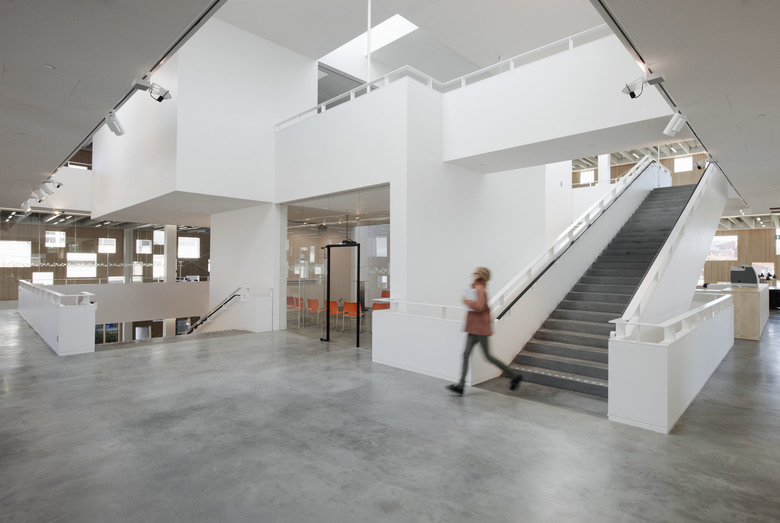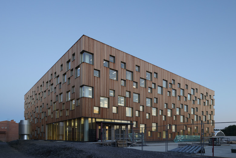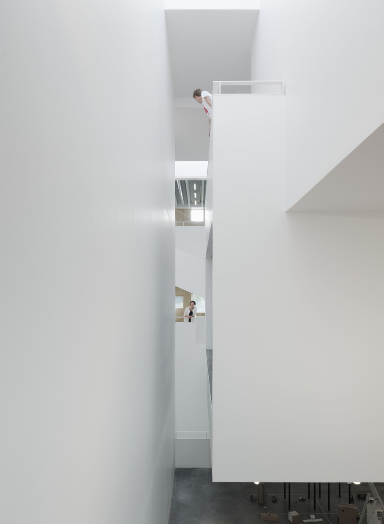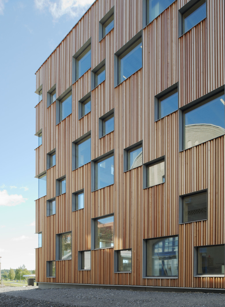 As a growth centre for the architecture of the future, Umeå School of Architecture will provide the framework for inspiration and innovation. From the outside, the building has a cubic expression with its larch facades and square windows placed in a vibrant, rhythmic sequence on all sides. The interior space of the building is designed as a dynamic sequence of stairs and split, open floor levels where abstract, white boxes hang freely from the ceiling filtering the light coming in through the high skylights.