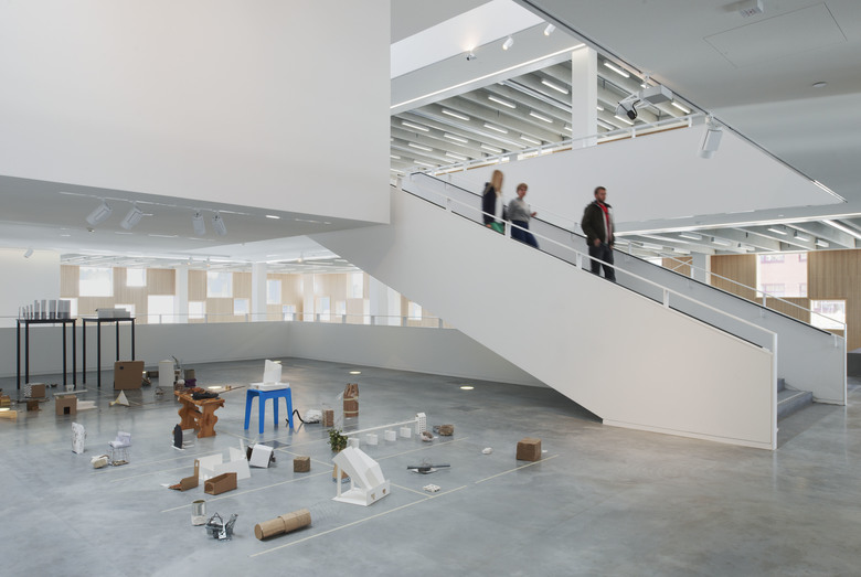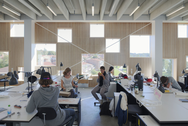 Umeå School of Architecture has a unique location by Umeå River. With its interior landscape of open floor levels and sculpturally shaped stairs, the building resonates with creativity and artistic experimenting.