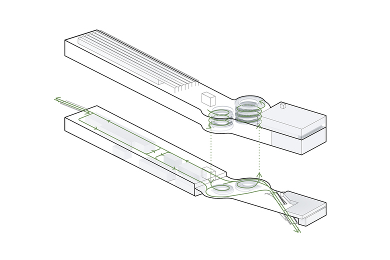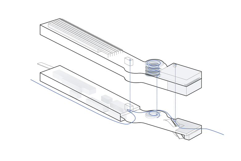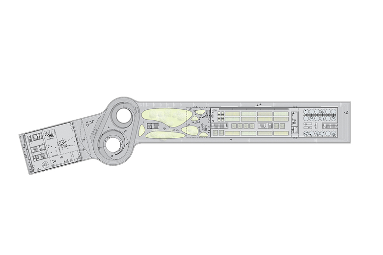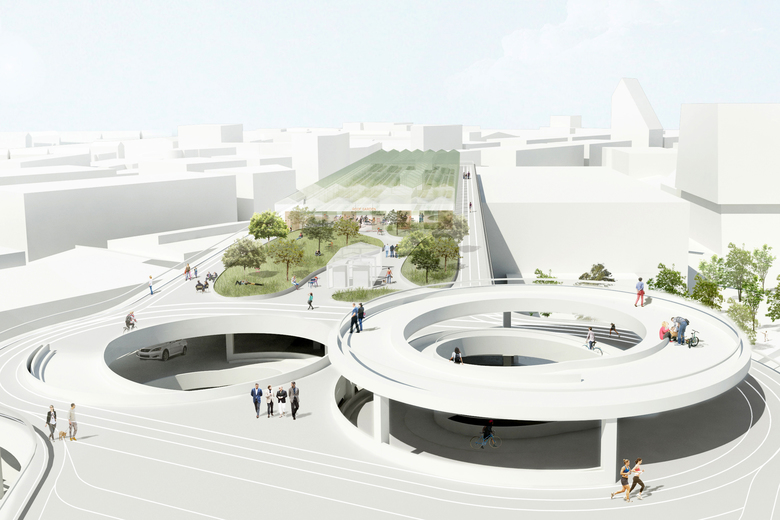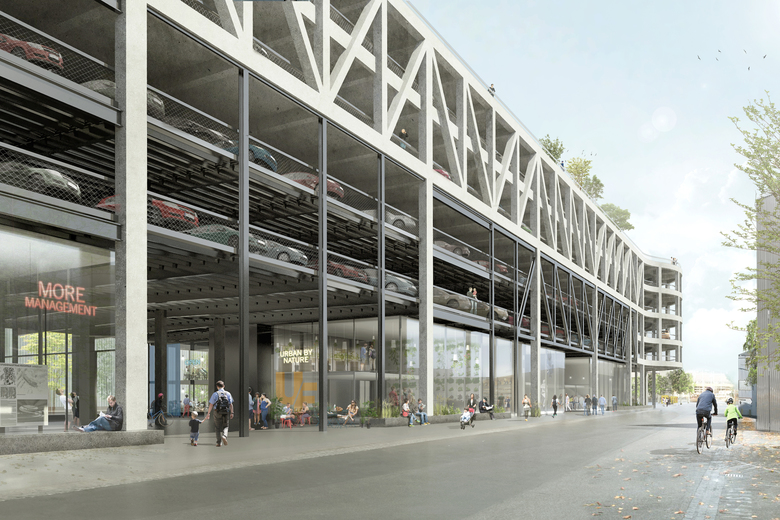 Parking & More is a public facility and mixed use structure for parking and a variety of public and private programs. The new concrete structure will be placed over the existing standard steel parking lot. The current building will be renovated and fully integrated into a new and much larger parking. The goal is to create intense and multilayered infrastructure, which works as an urban hinge, connecting and regulating different type of mobility flows, both from north to south and east to west. The fully open structure has ceiling heights which are slightly above standard heights for parking to accommodate other permanent and temporary built-in programs.