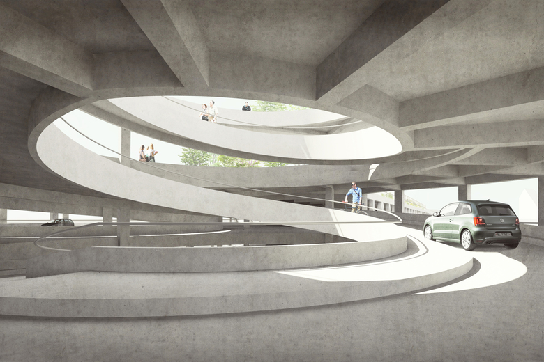 All internal circulation is organized with two centrally located spiral ramps leading up to the roof. They allow for a direct access with cars and bikes to all floors including the roof. An additional sideway for pedestrians, located on the inside of a ramp leads to the public viewing platform, offering a great view over the fast developing area of the Dreispitz quarter.