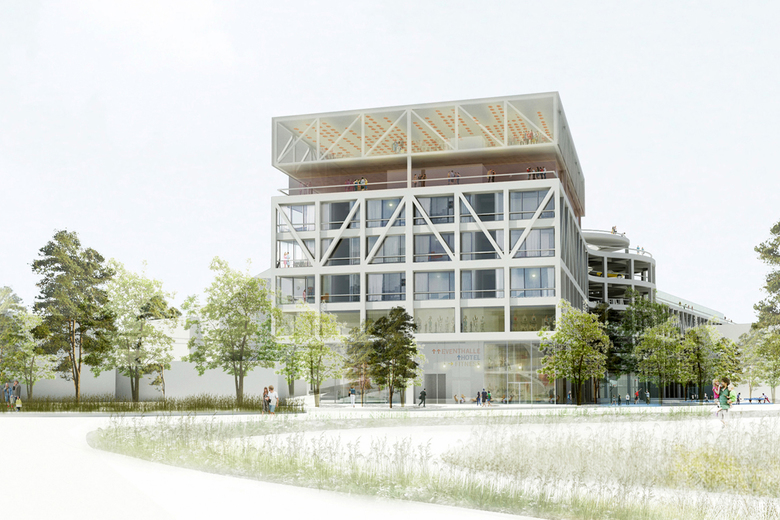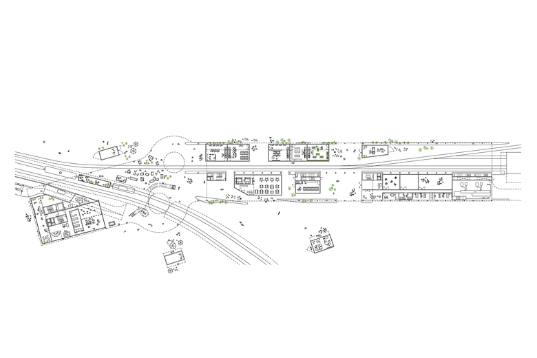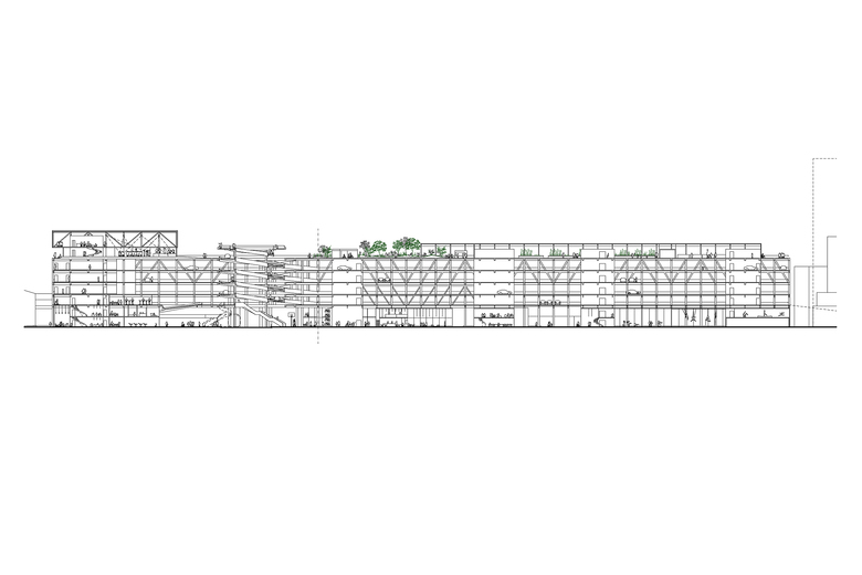 A series of small scale shops, bars and restaurants are located on the ground floor, creating a vibrant and lively street and a partially covered urban plaza with different sport facilities and temporary pop-up stores. Beside parking there is a motel and a sports club integrated on the upper floors. The roof top is used for urban farming and provides a public garden with a restaurant, bars and an event hall overlooking the city.