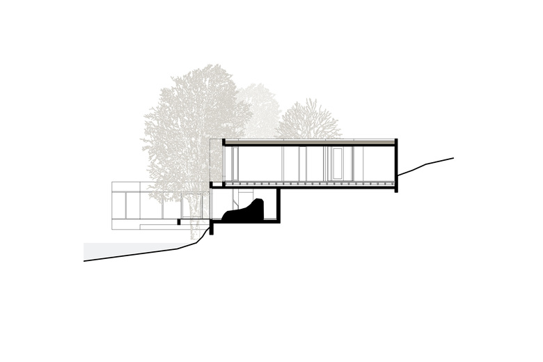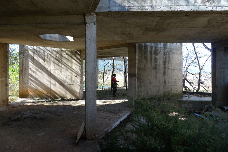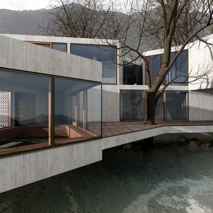 Removing the walls of the polygon resignifies the thresholds and windows of the house as mediators between worlds. The house replicates a space of organic transitions: the building incorporates itself to the gradient of the land site and makes the existing trees and water an integral part of its environment. The materials and details of the building blend in the austere and restrained harshness of nature unaffected by time: dark hardwood flooring, windows and shutters; concrete made with bamboo boarding.