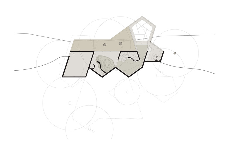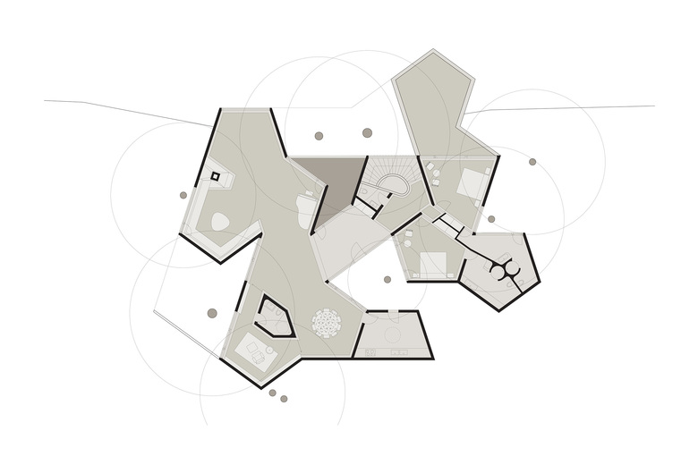 Whilst a geometric shape may strike us as simple, geometric repetition itself can be complex itself. Regular pentagons do not tessellate; it is not possible to arrange them without leaving remnants. But as in the silences of a conversation, the left out spaces become essential for the layout of the house; it is through these spaces that the building communicates the most subtle aspects of its form. The offcuts blur the underlying pattern and allow the interplay of light and shadow, of natural and inhabited space; they achieve an intimate exterior and a soothing interiority.