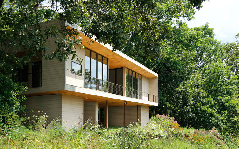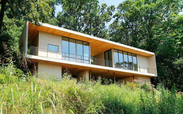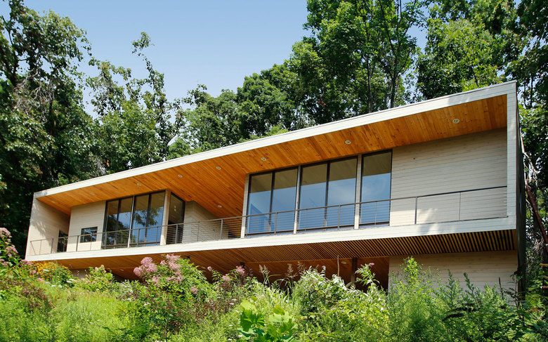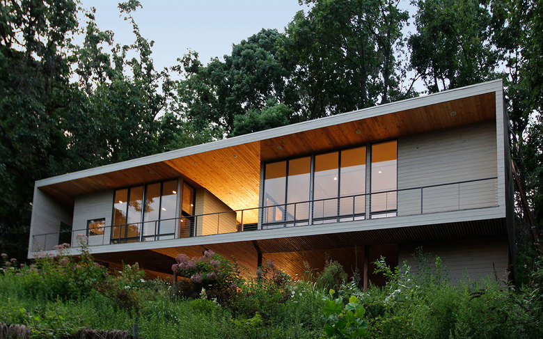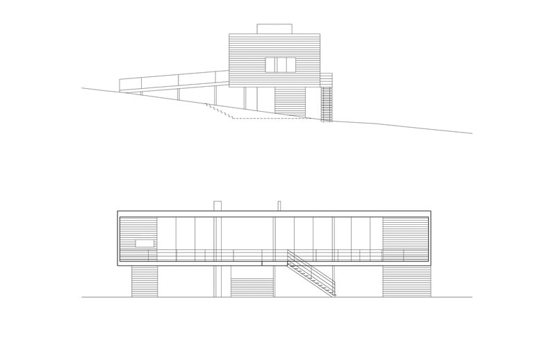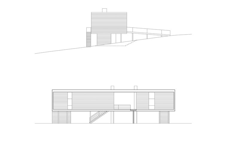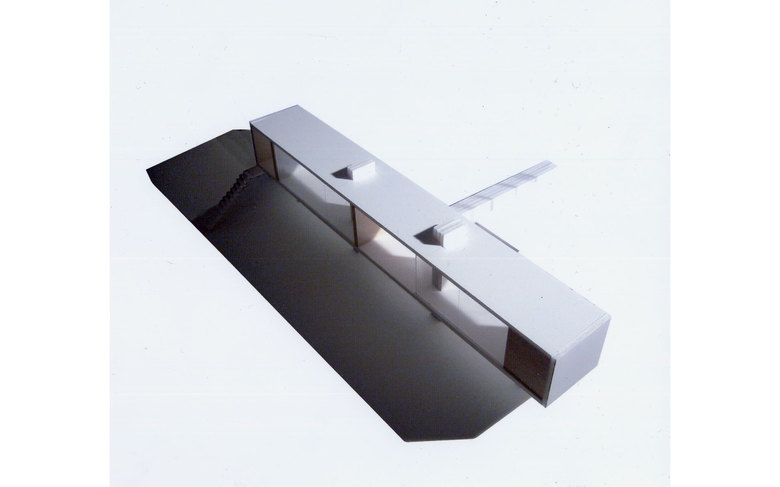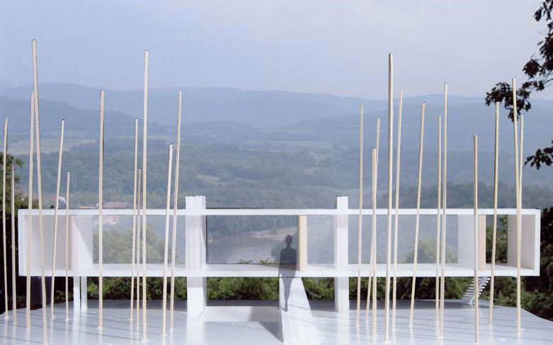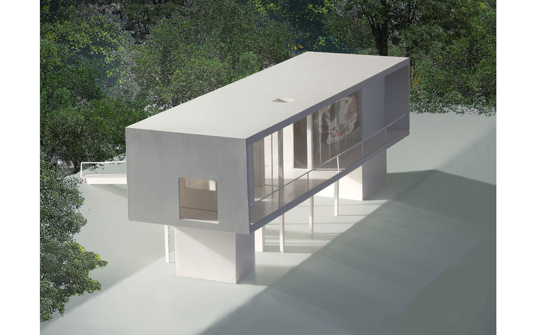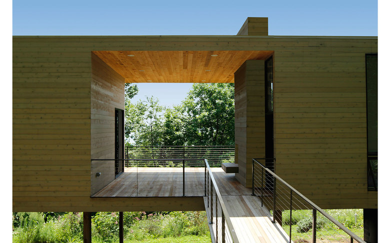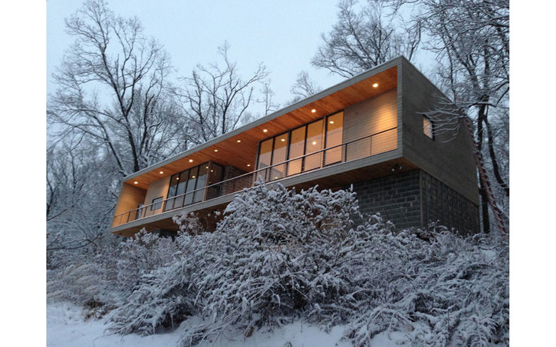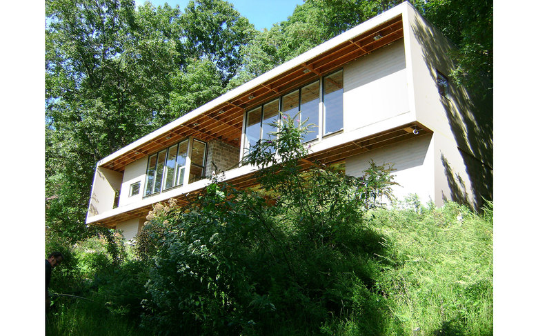 Bridge-Studio is a new artist studio building in Easton, Pennsylvania, designed for a couple who are both artists and gallery owners in New York City. Bridge-Studio houses a painting studio for the husband on the east side, and a writing studio on the west side. An open air breezeway runs through the center of Bridge-Studio, connecting back to the site with an entry ramp to the north. Bridge-Studio is entered by walking up the entry ramp, into the open breezeway overlooking the Delaware River, approximately 120 feet below the site.