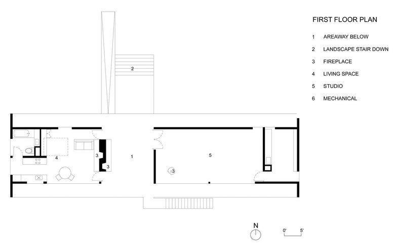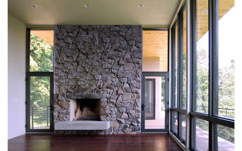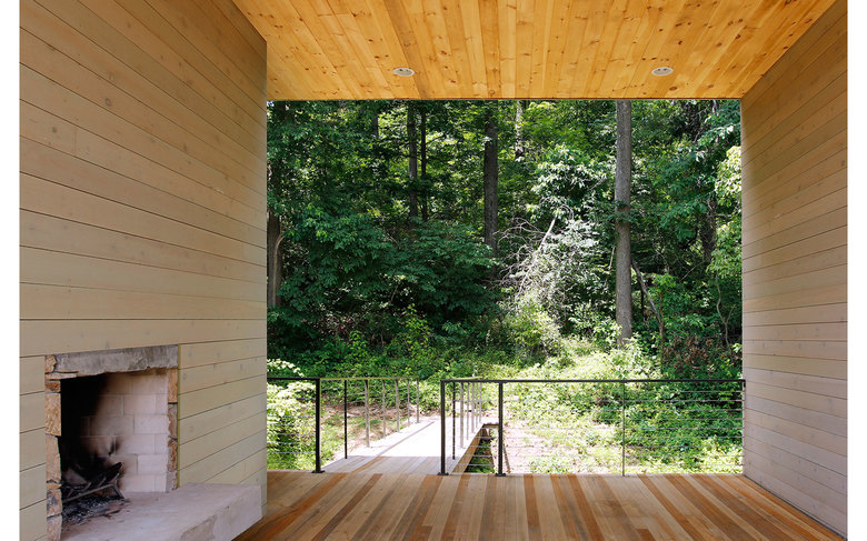 The breezeway fireplace hearth houses a flue for a fireplace in the breezeway, in the writing studio, and a third fireplace in the outdoor area below the deck. In addition to producing their own bodies of work, the clients own a prominent gallery in Williamsburg, New York, and a gallery/ event space, also in Williamsburg. The clients regularly entertain artists and clients from their New York gallery at their home in Pennsylvania. The couple’s desire for an appropriate setting to entertain artist friends created part of the program for the Bridge-Studio.