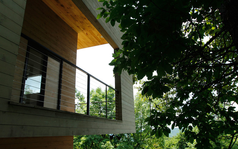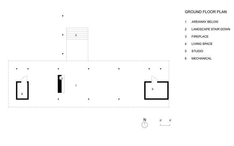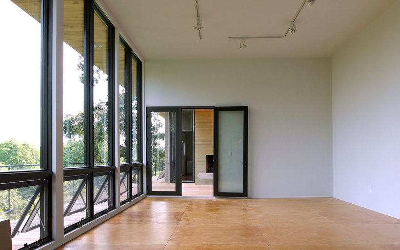 The architects designed Bridge-Studio as a kit-of-parts, as the studio is being built by the husband, and has been in construction since 2005. The project is nearly complete. The insulation and the underside of the roof needs to be installed, as well as the insulation and the underside of the deck below. All exterior/ interior walls need to be insulated and sheet-rocked. The fireplace hearth is built, and the client has partially installed the exterior stone sheathing. The final construction will include installation of balcony and ramp rails, as required for inspection for the certificate of occupancy.